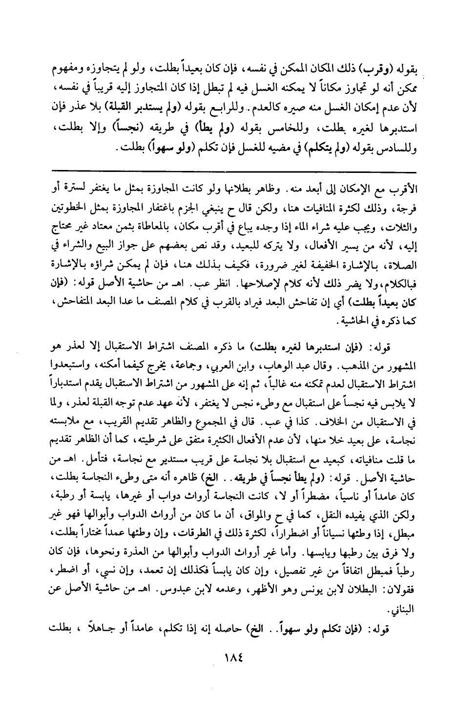 الأقرب مع الإمكان إلى أبعد منه . وظاهر بطلانها ولو كانت المجاوزة مثل ما يفتقر لسترة أو فرجة وذلك لكثرة المنافيات هنا . ولكن قال ( ح ) : ينبغي الجزم باغتفار المجاوزة بمثل الخطوتين ، والثلاثة . ويجب عليه شراء الماء إذا وجده يباع في أقرب مكان بالمعاطاة بثمن معتاد غير محتاج إليه ، لأنه من يسير الأفعال ولا يتركه للبعيد . وقد نص بعضهم على جواز البيع والشراء في الصلاة بالإشارة الخفيفة لغير ضرورة ، فكيف بذلك هنا ، فإن لم يكن شراؤه بالإشارة فبالكلام ولا يضر ذلك لأنه كلام لإصلاحها انظر : عب ( اه . من حاشية الأصل ) .