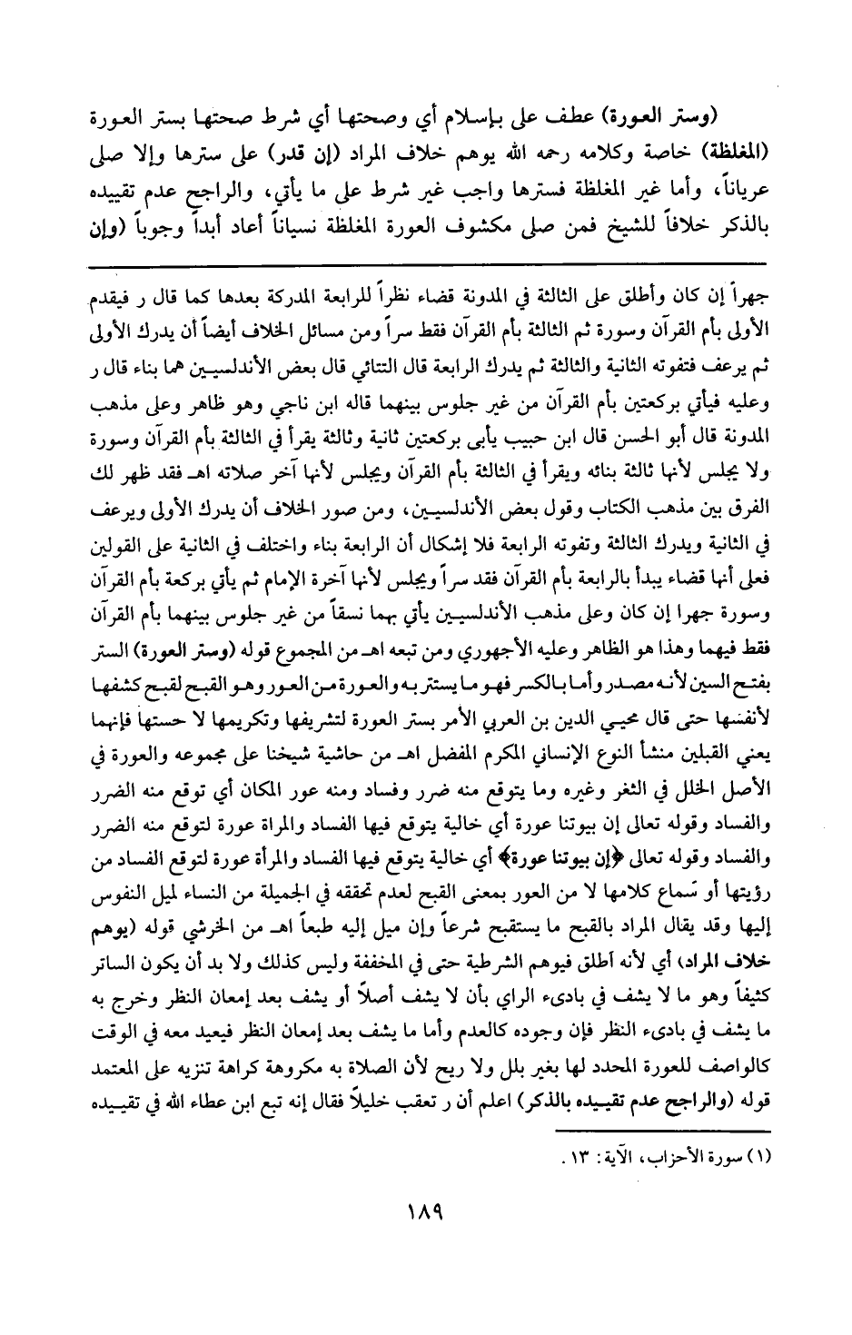 قوله : 16 ( وستر العورة ) : الستر بفتح السين لأنه مصدر ، وأما بالكسر فهو ما يستتر به . والعورة : من العور ، وهو القبح لقبح كشفها لانفسها ، حتى قال محي الدين بن العربي : الأمر بستر العورة لتشريفها وتكريمها لالخستها فإنهما يعني القبلين منشأ النوع الإنساني المكرم المفضل . ( اه . من حاشية شيخنا على مجموعه ) .