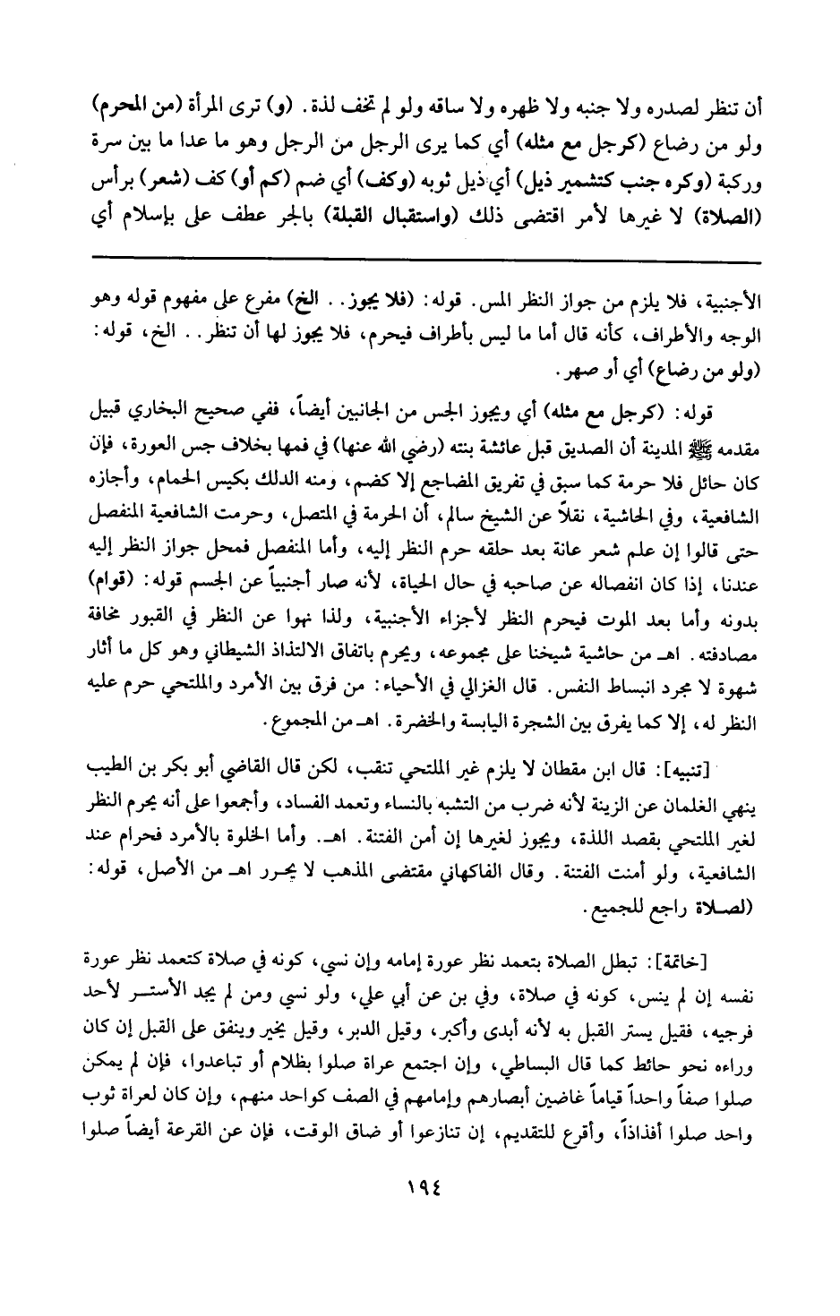 خاتمة : تبطل الصلاة بتعمد نظر عورة إمامه وإن نسي كونه في صلاة كتعمد نظر عورة نفسه إن لم ينس كونه في صلاة ، وفي ( بن ) علي : ولو نسي . ومن لم يجد إلا ستراً لأحد فرجيه ، فقيل : يستر القبل به لأنه أبدي وأكبر ، وقيل : الدبر ، وقيل يخير . ويتفق على القبل إن كان وراءه نحو حائط كما قال البساطي . وإن اجتمع عراة صلوا بظلام أو تباعدوا ، فإن لم يمكن صلوا صفاً واحداً قياماً غاضين أبصارهم ، وإمامهم في الصف كواحد منهم . وإن كان لعراة ثوب واحد صلوا أفذاذاً وأقرع للتقديم إن تنازعوا ، أو ضاق الوقت . فإن ضاق عن القرعة أيضاً صلوا
