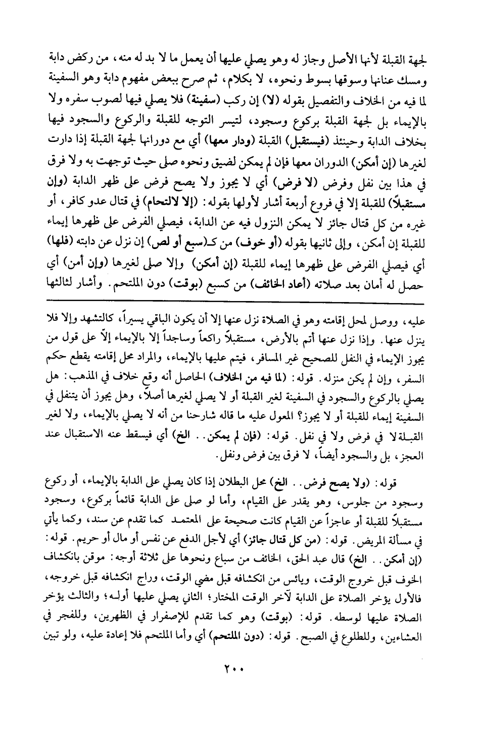 عليه ، ولو وصل لمحل إقامته وهو في الصلاة نزل عنها إلا أن يكون الباقي يسيراً كالتشهد ، وإلا فلا ينزل : عنها . وإذا نزل عنها أتم بالأرض مستقبلاً راكعاً وساجداً لا بالإيماء إلا على قول من يجوز الإيماء في النفل للصحيح غير المسافر ، فيتم عليها بالإيماء والمراد محل إقامته الذي يقطع حكم السفر وإن لم يكن منزله .