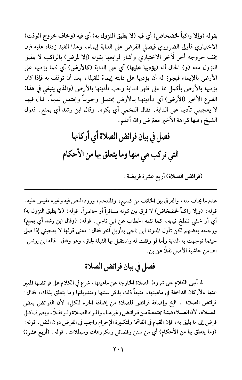 لما أنهى الكلام على شروط الصلاة الخارجية عن ماهيتها ، شرع في الكلام على فرائضها المعبر عنها بالأركان الداخلة في ماهيتهامتبعاً ذلك بذكر سننها ومندوباتها وما يتعلق بذلك . فقال : 16 ( فرائض الصلاة ) إلخ : وإضافة فرائض للصلاة من إضافة الجزء للكل ، لأن الفرائض بعض الصلاة ، لأن الصلاة هيئة مجتمعة من فرائض وغيرها . والمراد : الصلاة ولو نفلا ، ويصرف كل فرض إلى ما يليق به فإن القيام في الفاتحة ولتكبيرة الإحرام واجب في الفرض دون النفل .