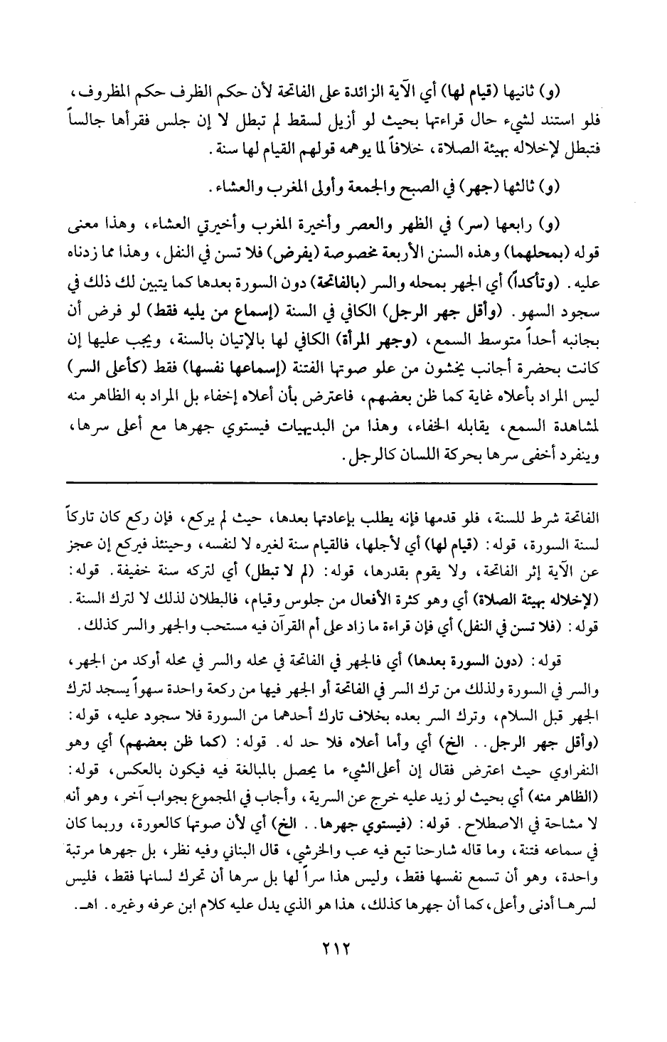قوله : ( فيستوى جهرها ) إلخ : أي لأن صوتها كالعورة وربما كان في سماعه فتنة ، وما قاله شارحنا تبع فيه 16 ( عب ) والخرشي قال البناني : وفيه نظر بل جهرها مرتبة واحدة وهو أن تسمع نفسها فقط . وليس هذا سراً لها ، بل سرها أن تحرك لسانها فقط ، فليس لسرها أدنى وأعلى كما أن جهرها كذلك ، هذا هو الذي يدل عليه كلام ابن عرفة وغيره 16 ( 1 هـ )
