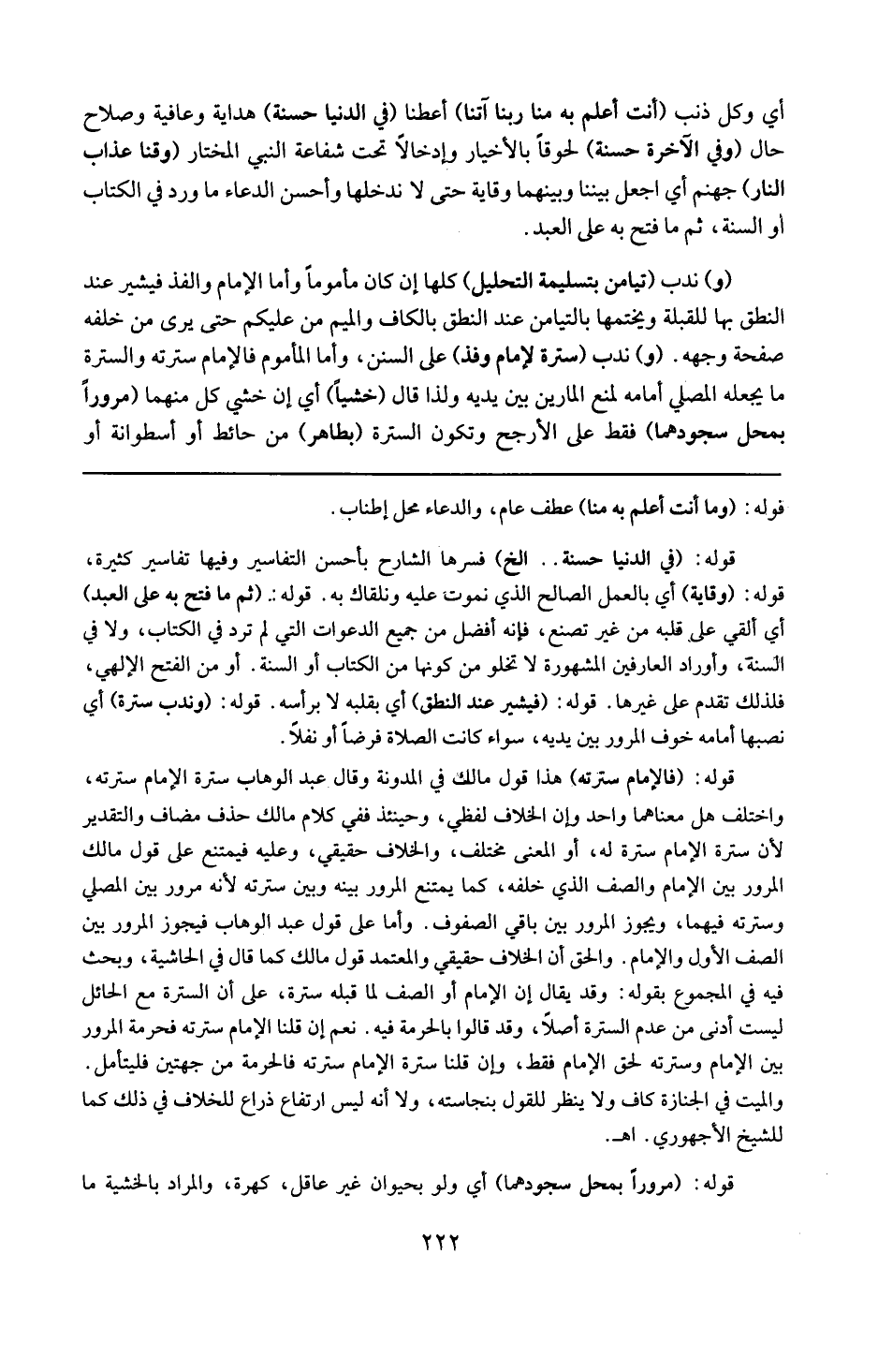 قوله : 16 ( فالإمام سترته ) : هذا قول مالك فى المدونة ، وقال عبد الوهاب : سترة الإمام سترته . واختلف : هل معناهما واحد وأن الخلاف لفظى ؟ وحينئذ ، ففى كلام مالك حذف مضاف ، والتقدير : لأن سترة الإمام له أو المعنى مختلف . والخلاف حقيقى ، وعليه فيمتنع على قول مالك المرور بين الإمام والصف الذى خلفه كما يمتنع المرور بينه وبين سترته لأنه مرور بين المصلى وسترته فيهما ويجوز المرور بين باقى الصفوف ، وأما على قول عبد الوهاب فيجوز المرور بين الصف الأول و الإمام . والحق أن الخلاف حقيقى ، والمعتمد قول مالك كما قال فى الحاشية . وبحث فيه فى المجموع بقوله : وقد يقال إن الإمام أو الصف لما قبله سترة ، على أن السترة مع الحائل ليست أدنى من عدم السترة أصلا وقد قالوا بالحرمة فيه ، نعم إن قلنا الإمام سترته فحرمة المرور بين الإمام وسترته لحق الإمام فقط ، وإن قلنا سترة الإمام سترته فالحرمة من جهتين فليتأمل . والميت فى الجنازة كاف ولا ينظر للقول بنجاسته ولا أنه ليس ارتفاع ذراع للخلاف فى ذلك كما للشيخ الأجهورى ا هـ .