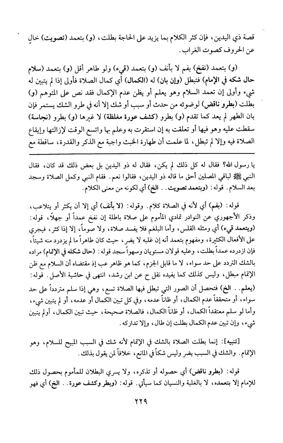 يا رسول الله ؟ فقال له : كل ذلك لم يكن ، فقال ذو اليدين بل بعض ذلك قد كان فقال النبي لباقي المصلين أحق ما قاله ذو اليدين ؟ فقالوا : نعم . فقام النبي وكمل الصلاة وسجد بعد السلام ) .