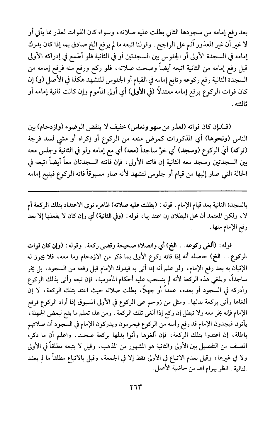 قوله : 16 ( وإن كان فوات الركوع ) إلخ : حاصله أنه إذا فاته ركوع الأولى بما ذكر من الازدحام وما معه فلا يجوز له الاتيان به بعد رفع الإمام ولو علم أنه إذا أتى به يدرك الإمام قبل رفعه من السجود بل يخر ساجداً ، ويلغى هذه الركعة لأنه لم ينسحب عليه أحكام المأمومية . فإن تبعه وأتى بذلك الركوع وأدركه في السجود أو بعده عمداً أو جهلاً ، بطلت صلاته حيث اعتد بتلك الركعة ، لا إن ألغاها وأتى بركعة بدلها . ومثل من زوحم على الركوع في الأولى ، المسبوق إذا أراد الركوع فرفع الإمام فإنه يخر معه ، ولا تبطل إن ركع إذا ألغى تلك الركعة . ومن هذا تعلم ما يقع لبعض الجهلة ؛ يأتون فيجدون الإمام قد رفع رأسه من الركوع فيحرمون ويدركون الإمام في السجود ، أن صلاتهم باطلة إن اعتدوا بتلك الركعة . فإن ألغوها وأتوا بدلها بركعة صحت . واعلم أن ما ذكره المصنف من التفصيل بين الأولى والثانية هو المشهور من المذهب . وقيل : لا يتبعه مطلقاً لا في الأولى ولا في غيرها . وقيل بعدم الاتباع في اوولى فقط إلا في الجمعة ، وقيل : بالاتباع مطلقاً مالم يعقد التالية ( انظر بهرام ا . هـ . من حاشية الأصل ) .