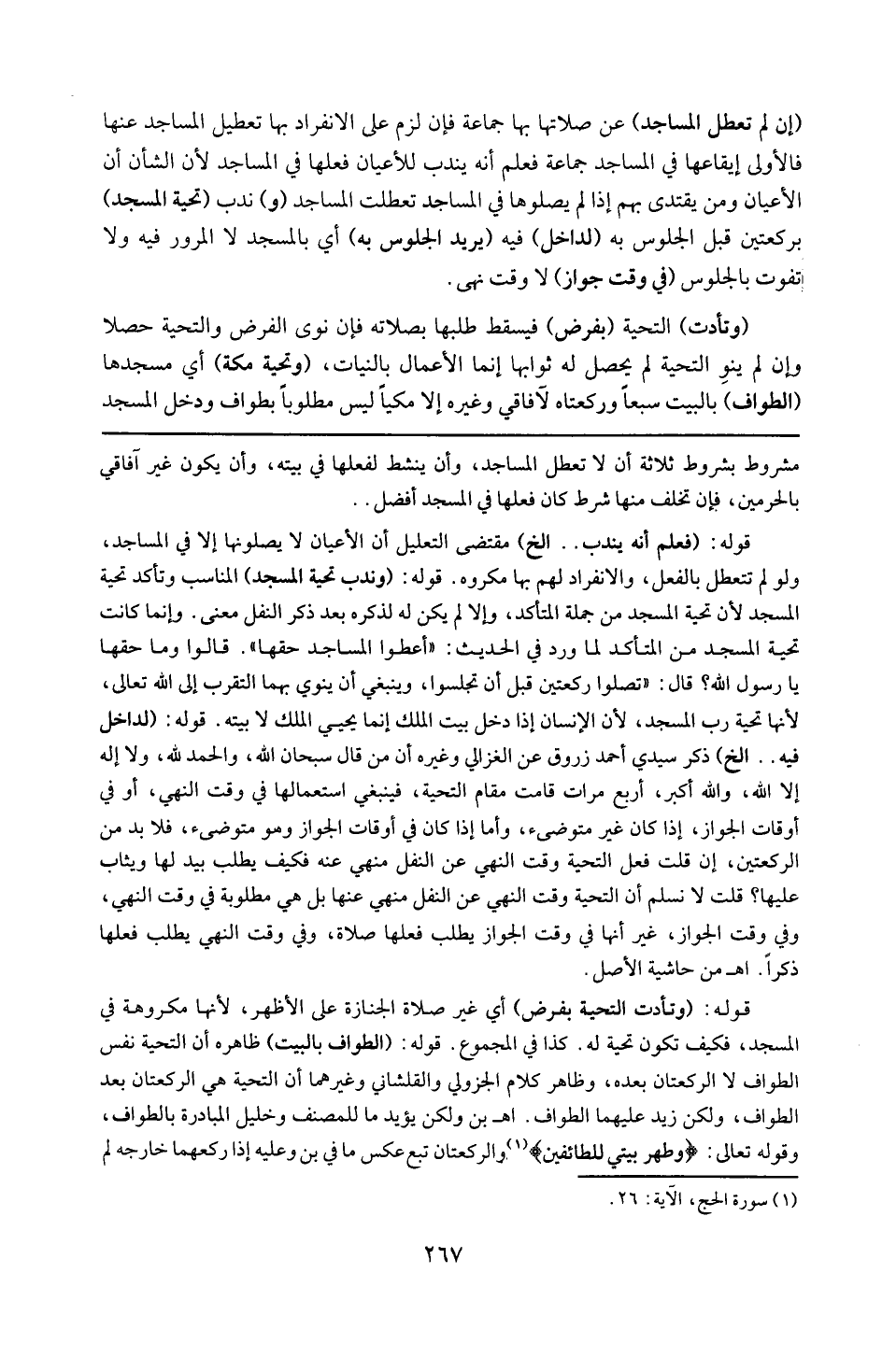 قوله : 16 ( وندب تحية المسجد ) : المناسب وتأكد تحية المسجد لأن تحية المسجد من جملة المتأكد وإلا لم يكن لذكره بعد ذكر النفل معنى . وإنما كانت تحية المسجد من المتأكد لما ورد في الحديث : ( أعطوا المساجد حقها ، قالوا : وما حقها يارسول الله ؟ قال تصلوا ركعتين قبل أن تجلسوا ) . وينبغي أن ينوي بهما التقرب إلى الله تعالى لأنها تحية رب المسجد لأن الإنسان إذا دخل بيت الملك إنما يحي الملك لا بيته .