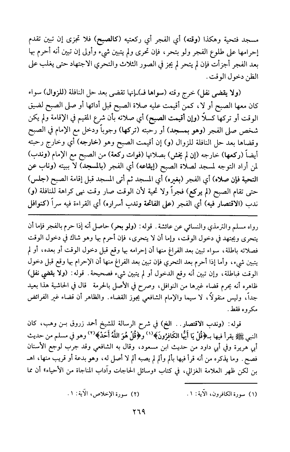قوله : 16 ( وندب الاقتصار ) إلخ : في شرح الرسالة للشيخ أحمد زروق ، ابن وهب كان النبي يقرأ فيها يا أيها الكافرون وقل هو الله أحد وهو في مسلم من حديث أبي هريرة ، وفي أبي داود من حديث ابن مسعود ، وقال به الشافعي . وقد جرب لوجع الأسنان فصح ، وما يذكر من قرأ فيها بألم وألم لم يصبه ألم لأصل له وهو بدعة أو قريب منها ( اه . بن ) ، لكن ذكر العلامة الغزالي في كتاب وسائل الحاجات واداب المناجاة من الإحياء أن مما