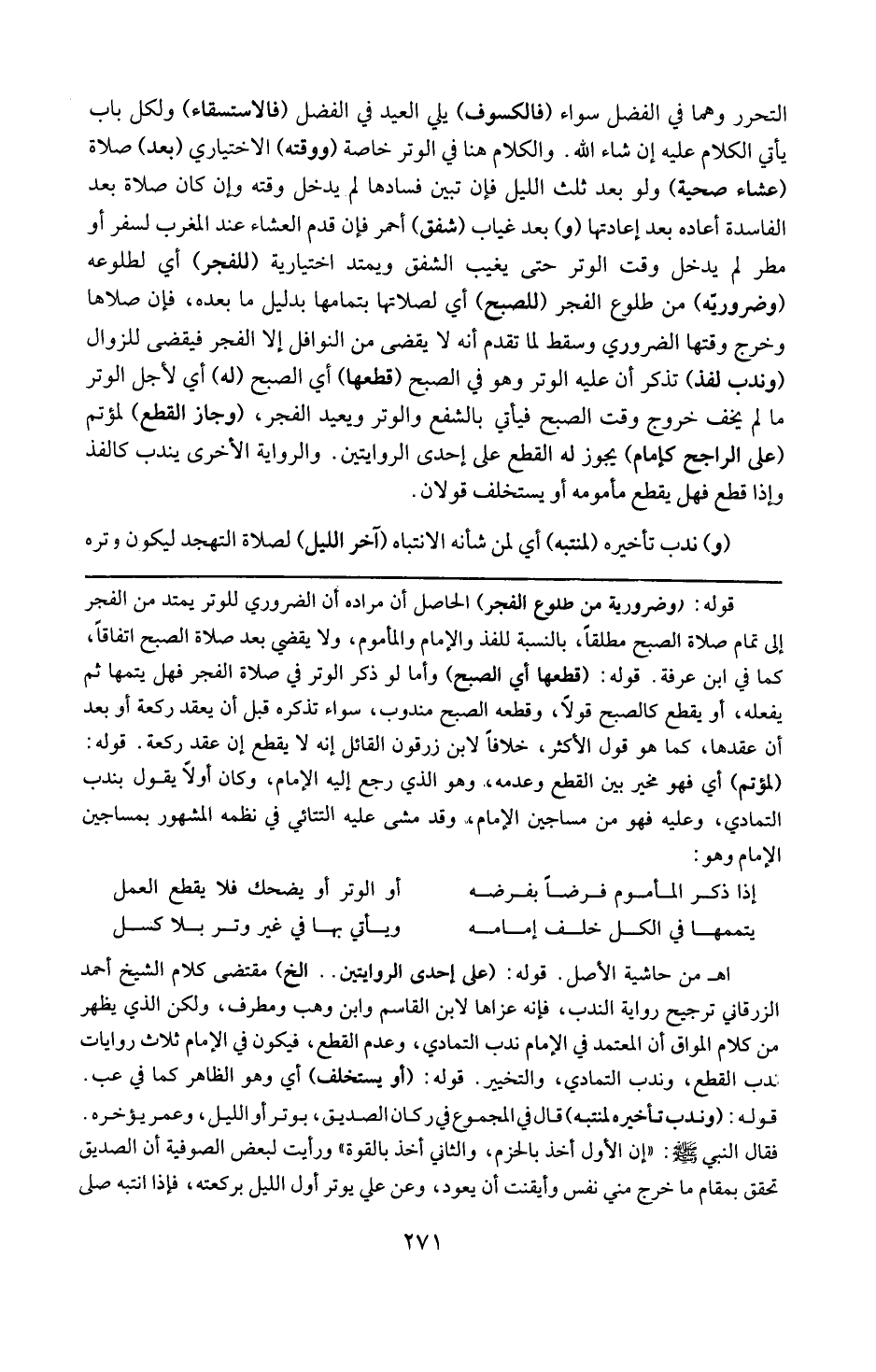 قوله : 16 ( وضروريه من طلوع الفجر ) : الحاصل أن مراده أن الضروري للوتر يمتد من الفجر إلى تمام صلاة الصبح مطلقاً بالنسبة للفذ والإمام والمأموم ، ولا يقضى بعد صلاة الصبح اتفاقاً كما في ابن عرفة .
