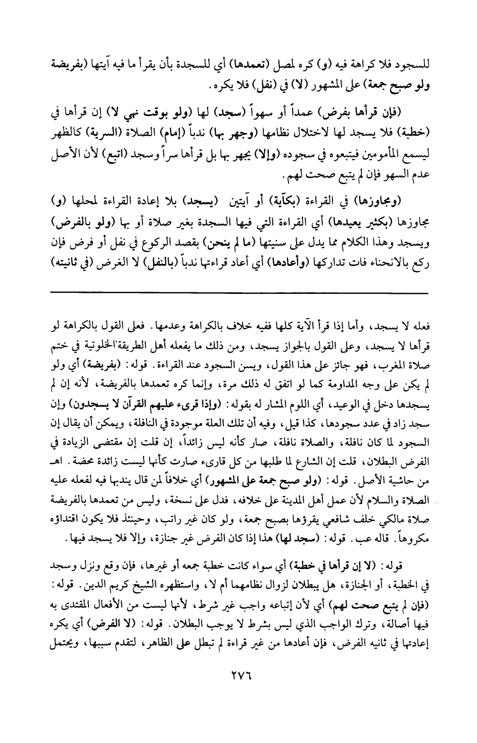 وقوله 16 ( بفريضة ) : أي ولو لم يكن على وجه المداومة كما لو اتفق له ذلك مرة وإنما كره تعمدها بالفريضة لأنه إن لم يسجدها دخل في الوعيد أي اللوم المشار له بقوله : ( وإذا قرىء عليهم القرآن لا يسجدون ) . وإن سجد زاد في عدد سجودها كذا قيل . وفيه أن تلك العلة موجودة في النافلة ويمكن أن يقال إن السجود لما كان نافلة والصلاة نافلة صار كأنه ليس زائداً . إن قلت : إن مقتضى الزيادة في الفرض البطلان ، قلت : إن الشارع لما طلبها من كل قارىء صارت كأنها ليست زائدة محضة ( 1 هـ من حاشية الأصل ) .