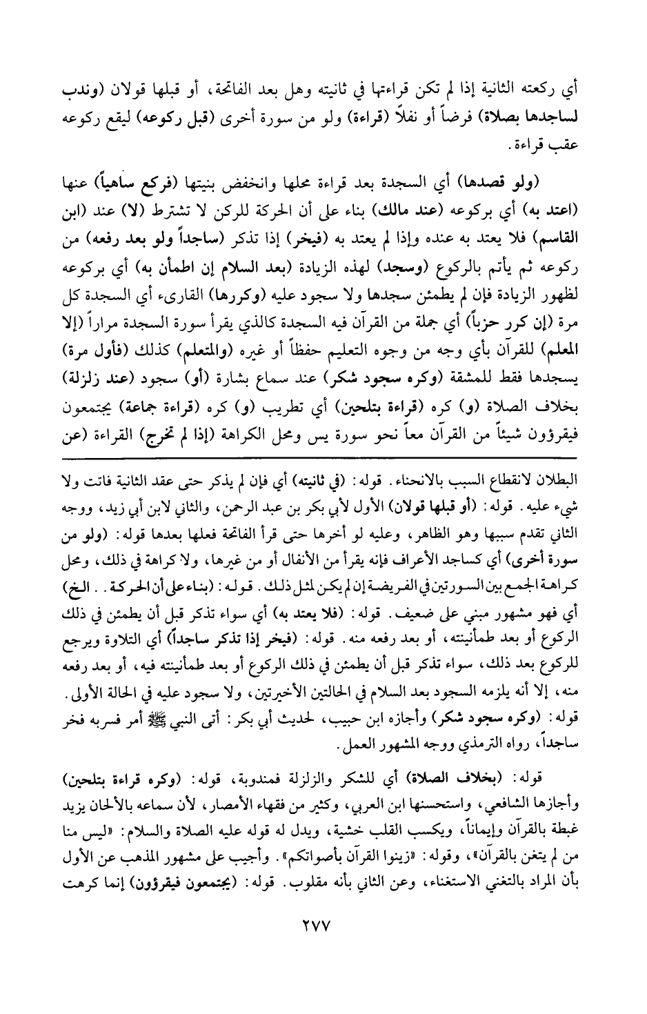 قوله : 16 ( وكره قراءة بتلحين ) : وأجازها الشافعي واستحسنها ابن العربي وكثير من فقهاء الأمصار ، لأن سماعه بالألحان يزيد غبطة بالقرآن ، وإيماناً ويكسب القلب خشية ويدل له قوله عليه الصلاة والسلام : ( ليس منا من لم يتغن بالقرآن ) وقوله : ( زينوا القرآن بأصواتكم ) وأجيب على مشهور المذهب عن الأول : بأن المراد بالتغني الاستغناء وعن الثاني بأنه مقلوب .