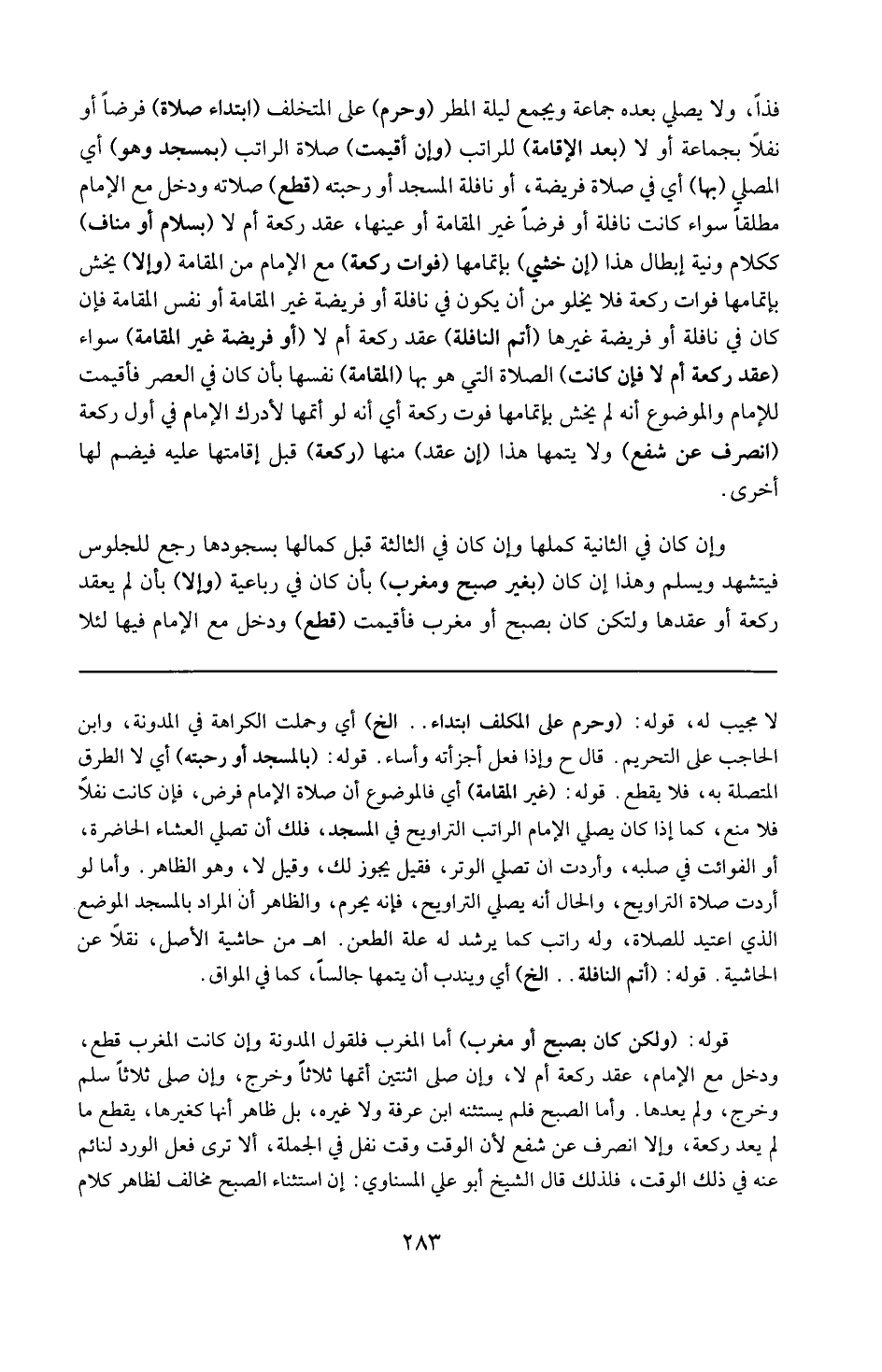 قوله : 16 ( غير المقامة ) : أي فالموضوع أن صلاة الإمام فرض ، فإن كانت نفلاً فلا منع كما إذا كان يصلي الإمام الراتب التراويح في المسجد فلك أن تصلي العشاء الحاضرة أو الفوائت في صلبه . ولو أردت أن تصلي الوتر ، فقيل : يجوز لك ذلك . وقيل : لا ، وهو الظاهر . وأما لو أردت صلاة التراويح والحال أنه يصلي التراويح فإنه يحرم . والظاهر أن المراد بالمسجد : الموضع الذي اعتيد للصلاة وله راتب كما يرشد له علة الطعن ( 1 هـ من حاشية الأصل نقلاً عن الحاشية ) .