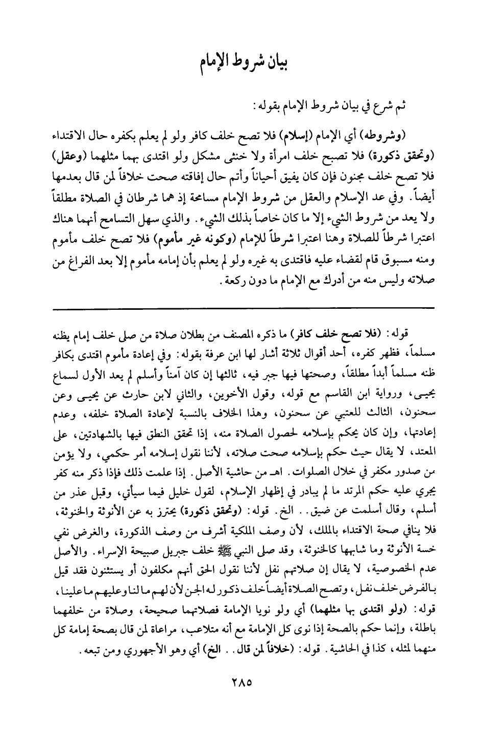 قوله : 16 ( وتحقق ذكورة ) : يحترز به عن الأنوثة والخنوثة ، فلا ينافي ضحة الاقتداء بالملك ، لأن وصف الملكية أشرف من وصف الذكورة ، والغرض نفى خسة الأنوثة وما شابهها كالخنوثة . وقد صلى النبي خلف جبريل صبيحة الإسراء ، والأصل عدم الخصوصية . لا يقال إن صلاتهم نفل لأننا نقول : الحق أنهم مكلفون ، أو يستثنون فقد قيل بالفرض خلف نفل . وتصح الصلاة أيضاً خلف ذكور الجن لأن لهم مالنا وعليهم ما علينا .