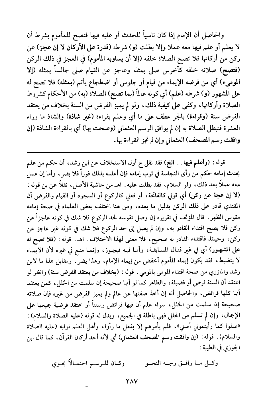 قوله : 16 ( أو علم فيها ) إلخ : فقد نقل ( ح ) أول الاستحلاف عن ابن رشد أن حكم من علم بحدث إمامه حكم من رأى النجاسة في ثوب إمامه ، فإن أعلمه بذلك فوراً فلا يضر ، وأما إن عمل معه عملا بعد ذلك ولو السلام فقد بطلت عليه . ( اه . من حاشية الأصل نقلا عن بن ) .
