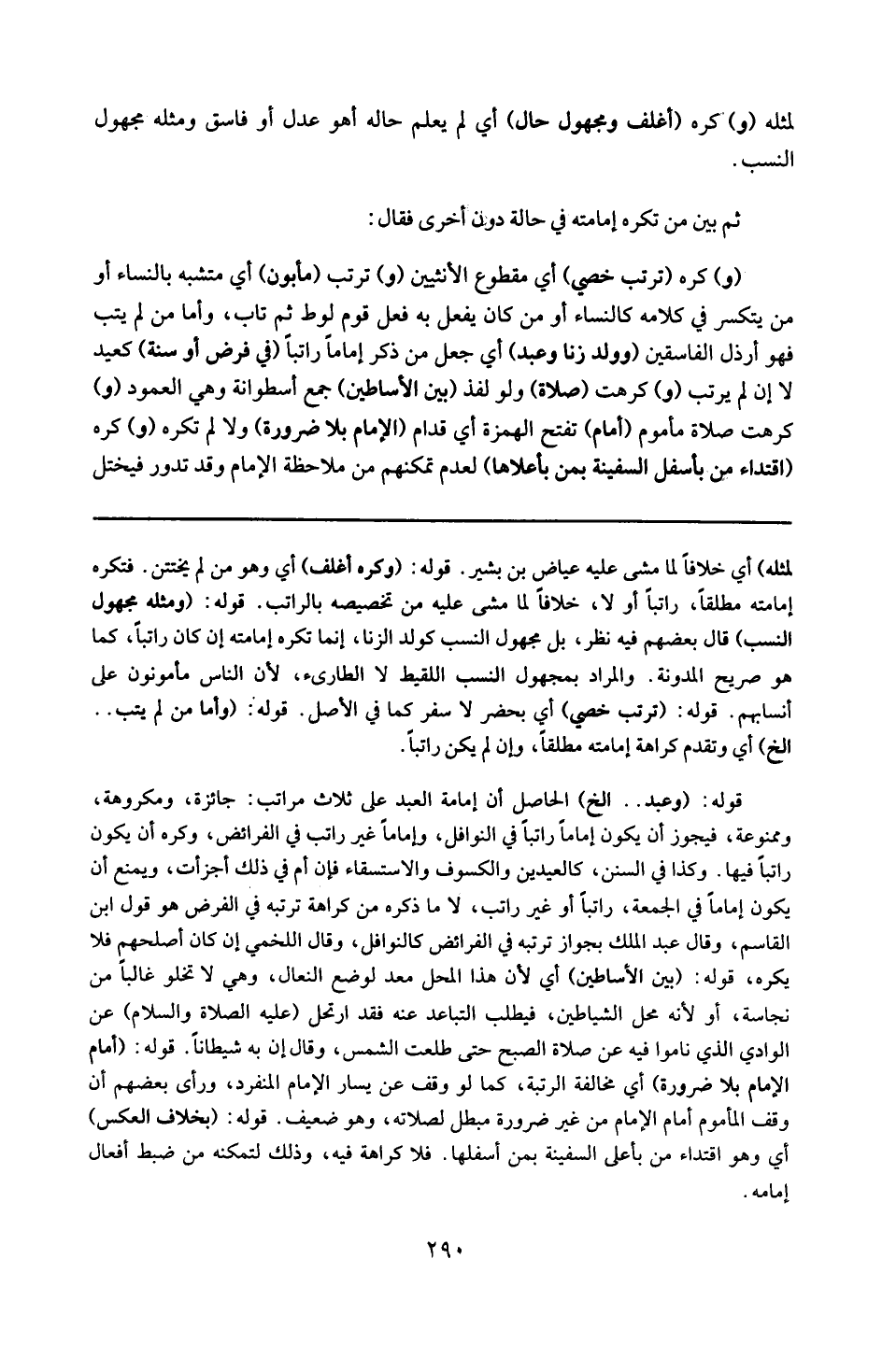 قوله : 6 ( أمام الإمام بلا ضرورة ) : أي لمخالفة الرتبة ، كما لو وقف عن يسار الإمام المنفرد . ورأى بعضهم أن وقوف المأموم أمام الإمام من غير ضرورة مبطل لصلاته ، وهو ضعيف .