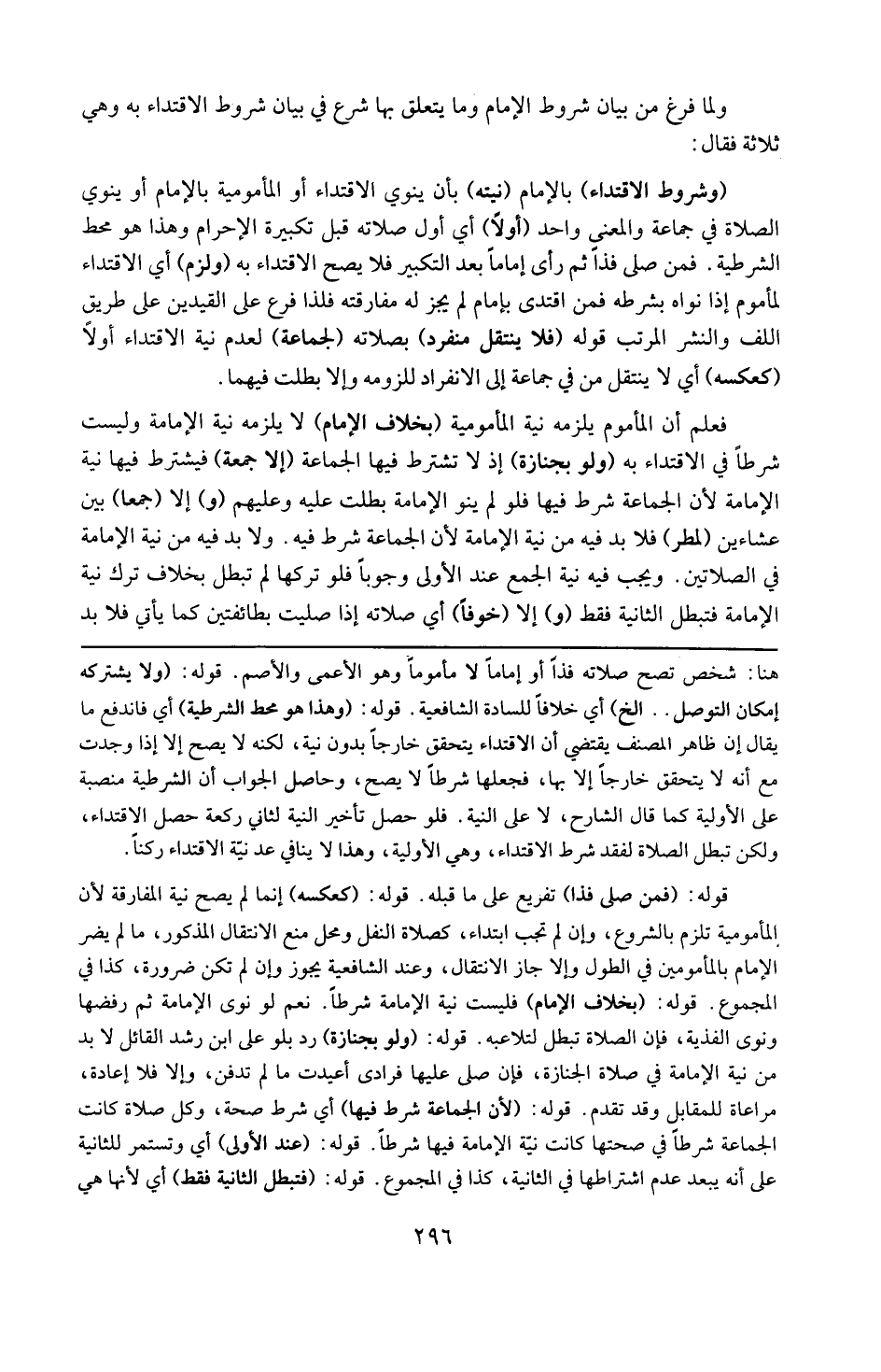 قوله : 16 ( وهذا هو محط الشرطية ) : أي فاندفع ما يقال : إن ظاهر المصنف يقتضي أن الاقتداء يتحقق خارجاً بدون نية ، لكنه لا يصح إلا إذا وجدت مع أنه لا يتحقق خارجاً إلا بها ، فجعلها شرطاً لا يصح ؟ وحاصل الجواب : أن الشرطية منصبة على الأولية كما قال الشارح لا على النية ، فلو حصل تأخير النية لثاني ركعة حصل الاقتداء ولكن تبطل الصلاة لفقد شرط وهي الأولية ، وهذا لا ينافي عد نية الاقتداء ركناً .