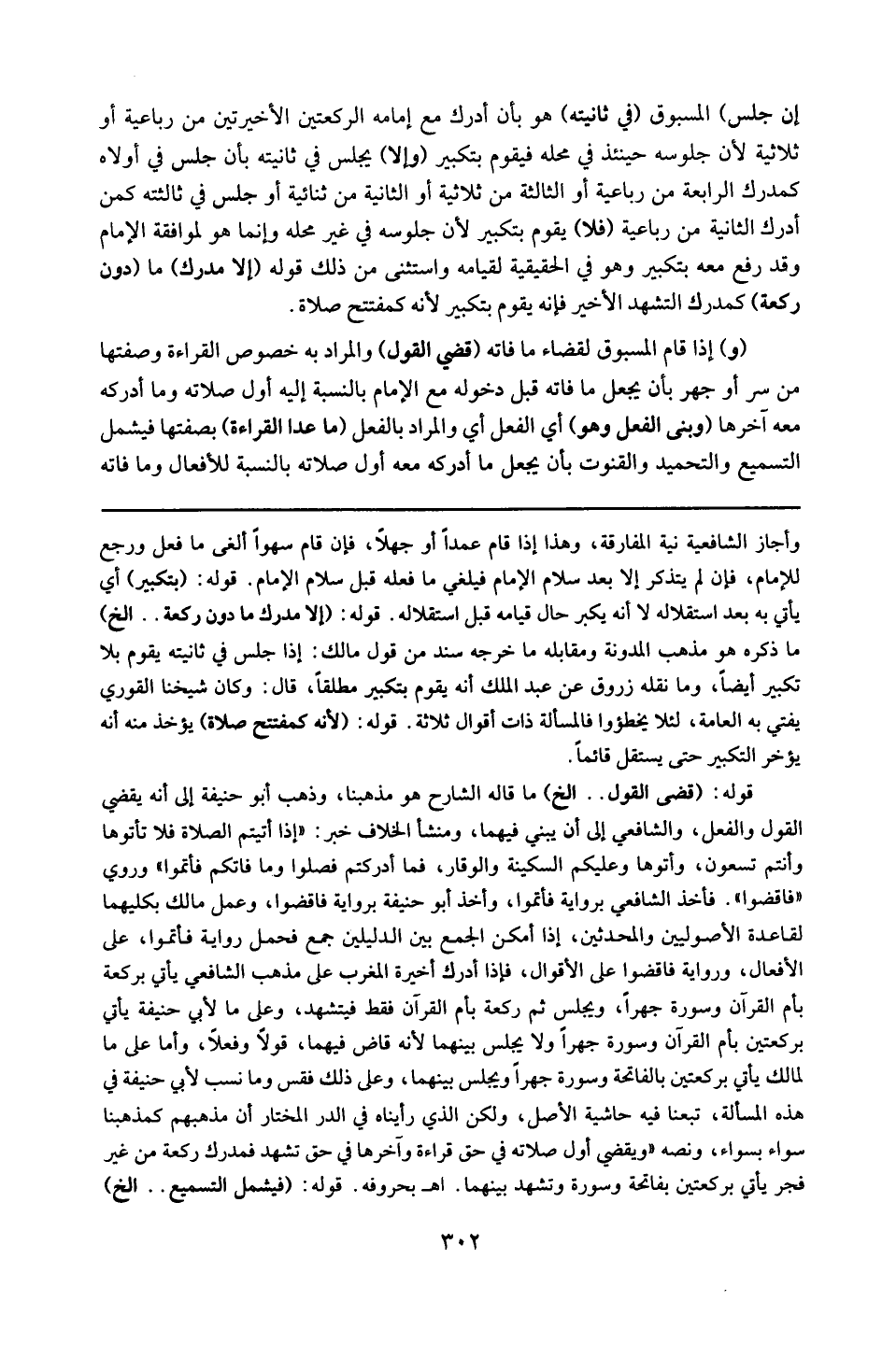 قوله : 16 ( قضي القول ) إلخ : ماقاله الشارح هو مذهبنا . وذهب أبو حنيفة إلى أنه يقضي القول والفعل ، والشافعي إلى أن يبني فيهما ومنشأ الخلاف خبر : ( إذا أتيتم الصلاة فلا تأتوها وأنتم تسعون ، وأتوها وعليكم السكينة والوقار ، فما أدركتم فصلوا وما فاتكم فأتموا ) وروى : ( فاقضوا ) فأخذ الشافعي برواية ( فأتموا ) وأخذ أبو حنيفة برواية : ( فاقضوا ) وعمل مالك بكليهما لقاعدة الأصوليين والمحدثين : إذا أمكن الجمع بين الدليلين جمع ، فحمل رواية ( فأتموا ) على الأفعال ، ورواية ( فاقضوا ) على الأقوال . فإذا أدرك أخيرة المغرب على مذهب الشافعي يأتي بركعة بأم القران وسورة جهراً ويجلس ، ثم بركعة بأم القران فقط فيتشهد . وعلى ما لأبي حنيفة : يأتي بركعتين بأم القران وسورة جهراً ولا يجلس بينهما لأنه قاض فيهما قولا وفعلا . وأما على ما لمالك يأتي بركعتين بالفاتحة وسورة جهراً ويجلس : بينهما ، وعلى ذلك فقس . وما نسب لأبي حنيفة في هذه المسألة تبعناً فيه حاشية الأصل ، ولكن الذي رأيناه في الدر المختار أن مذهبهم كمذهبنا سواء بسواء ؛ ونصه : ويقضي أول صلاته في حق قراءة واخرها في حق تشهد ، فمدرك ركعة من غير فجر يأتي بركعتين بفاتحة وسورة وتشهد بينهما ( اه . بحروفه ) .