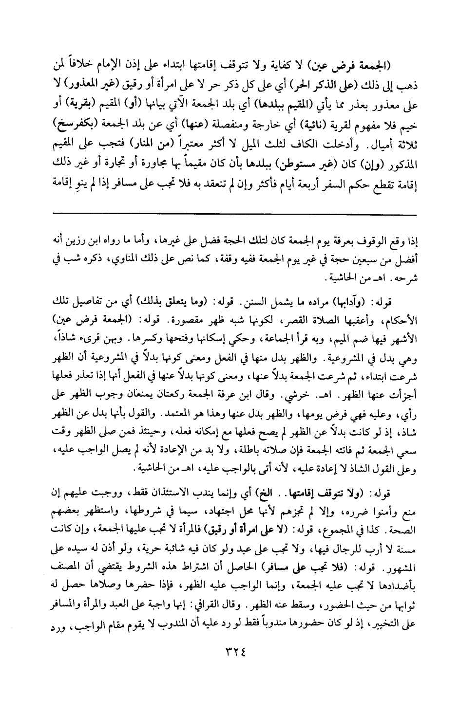 قوله : 16 ( لا على المرأة أو رقيق ) : فالمرأة لاتجب عليها الجمعة وإن كانت مسنة لا أرب للرجال فيها . ولا تجب على عبد ولو كان فيه شائبة حرية ، ولو أذن له سيده على المشهور .