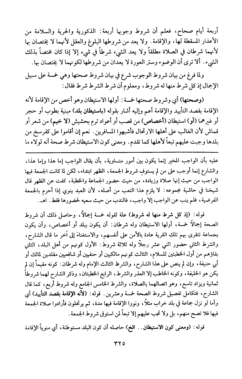 وحاصل ذلك أن شروط الصحة إجمالا خمسة : أولها الاستيطان وله شرطان : أن يكون ببلد أو أخصاص ، وأن يكون بجماعة تتقرى بهم تلك القرية عادة بالأمن على أنفسهم والاستغناء إلى اخر ما قال الشارح . والشرط الثاني : حضور اثني عشر رجلا ؛ وله ثلاثة شروط : الأول : كونهم من أهل البلد . الثاني : بقاؤهم من أول الخطبتين للسلام . الثالث : كونهم مالكيين أو حنفيين أو شافعيين مقلدين لمالك أو أبي حنفية وإن لم ينص على هذا الشارح . والشرط الثالث : الإمام . وله شرطان : كونه مقيما إن لم يكن هو الخليفة . وكونه الخاطب إلا لعذر ؛ والشرط الرابع : الخطبتان وذكر الشارح لهما شروطاً ثمانية ، ويزاد تاسع : وهو اتصالهما بالصلاة . والشرط الخامس : الجامع وله شروط أربع كما قال الشارح . فتكامل تفصيل شروط الصحة خمسة وعشرين .
