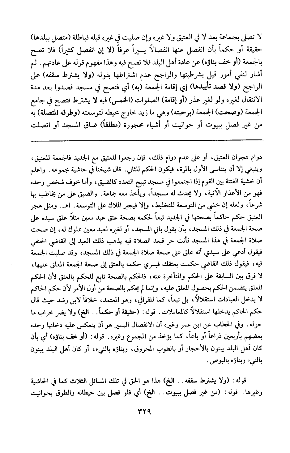 دوام هجران العتيق أو على عدم دوام ذلك ، فإن رجعوا للعتيق مع الجديد فالجمعة للعتيق ، وينبغي أن لا يتناسى الأول بالمرة فيكون الحكم للثاني . قال شيخنا في حاشية مجموعه : واعلم أن خشية الفتنة بين القوم إذا اجتمعوا في مسجد تبيح التعدد كالضيق ، وأما خوف شخص وحده فهو من الأعذار الآتية ، ولايحدث له مسجداً أو يأخذ معه جماعة والضيق على من يخاطب بها شرعاً ولعله إن خشي من التوسعة التخليط وإلا فيجبر الملاك على التوسعة . ( اه . ) ومثل هجر العتيق حكم حاكم بصحتها في الجديد تبعاً لحكمه بصحة عتق عبد معين مثلا علق سيده عتقه على صحة الجمعة في ذلك المسجد ، بأن يقول باني المسجد أو غيره لعبد معين مملوك له : إن صحت صلاة الجمعة في هذا المسجد فأنت حر فبعد الصلاة فيه يذهب ذلك العبد إلى القاضي الحنفي فيقول ادعي على سيدي أنه علق على صحة صلاة الجمعة في ذلك المسجد عتقي ، وقد صليت الجمعة فيه ، فيقول ذلك القاضي حكمت بعتقك فيسرى حكمه بالعتق إلى صحة الجمعة المعلق عليها ، لا فرق بين السابقة على الحكم والمتأخرة عنه ، فالحكم بالصحة تابع للحكم بالعتق ، لأن الحكم بالمعلق يتضمن الحكم بحصول المعلق عليه ، وإنما لم يحكم بالصحة من أول الأمر لأن الحكم الحاكم لا يدخل العبادات استقلالا ، بل تبعاً كما للقرافي وهو المعتمد ، خلافاً لابن رشد حيث قال : حكم الحاكم يدخلها استقلالا كالمعاملات .