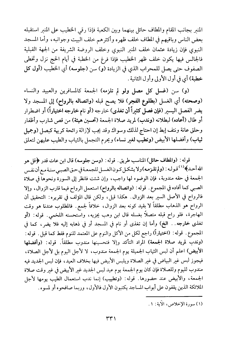 قوله : 16 ( وأفضلها الأبيض ) : اعلم أن لبس الثياب الجميلة يوم الجمعة مندوب لا لأجل اليوم بل لأجل الصلاة ، فيجوز لبس البياض في غير الصلاة ، ويلبس الأبيض فيها . بخلاف العيد فإن لبس الجديد فيه مندوب لليوم لا للصلاة . فإن كان يوم الجمعة يوم عيد لبس الجديد غير الأبيض في غير وقت صلاة الجمعة ، والأبيض عند حضورها .