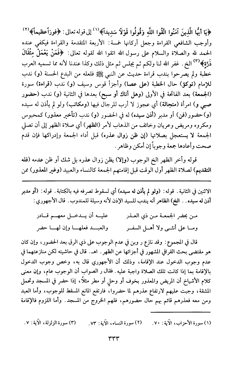 قال في المجموع : وقد نازع ( ر ) و ( بن ) في عدم الوجوب على ذي الرق بعد الحضور ، وإن كان هو مقتضى بحث القرافي المشهور في إجزائها عن الظهر . ( اه . ) قال في حاشيته : لكن منازعتهما في عدم وجوب الدخول عند الإقامة ، وذلك أن الأجهوري قال به وخص وجوب الدخول بالإقامة بما إذا كانت تلك الصلاة واجبة عليه ، فقال ( ر ) : الصواب أن الواجب عام ، وأن معنى كلام الأشياخ : أن المريض والمعذور بخوف أو وحل أو مطر مثلا إذا حضر في المسجد ، وتحمل المشقة وجبت عليهم لارتفاع عذرهم لما حضروا ، فارتفع المانع المسقط للوجوب ، وأما العبد ومن معه فعذرهم قائم بهم حال حضورهم فلهم الخروج من المسجد ، وأما اللزوم فالإقامة