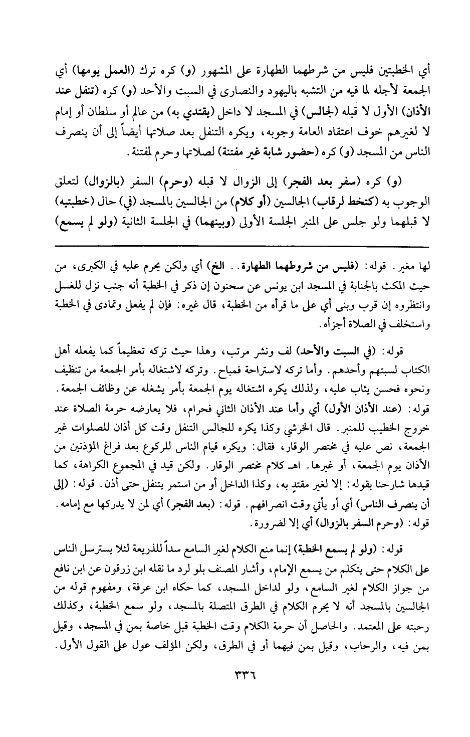 والحاصل أن حرمة الكلام وقت الخطبة ، قيل خاصة بمن في المسجد . ) ) 16 ( 16 ( وقيل بمن فيه والرحاب ، وقيل : بمن فيهما أو في الطرق ، ولكن المؤلف عول على القول الأول .