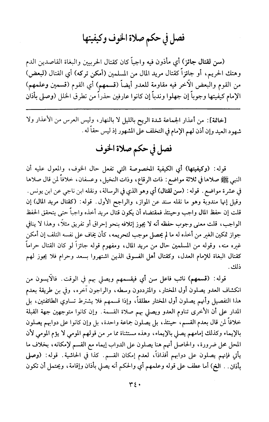 قوله : 16 ( قسمهم ) : نائب فاعل سن ، أي فيقسمهم ويصلي بهم في الوقت . فالآيسون من انكشاف العدو يصلون أول المختار ، والمترددون وسطه والراجون آخره . وفي ( بن ) طريقة بعدم هذا التفصيل وأنهم يصلون أول المختار مطلقاً . وإذا قسمهم فلا يشترط تساوي الطائفتين ؛ بل المدار على الأخرى تناوىء العدو . ويصلي بهم صلاة القسمة وإن كانوا متوجهين جهة القبلة خلافاً لمن قال بعدم القسم حينئذ ، بل يصلون جماعة واحدة . بل وإن كانوا على دوابهم يصلون بالإيماء ، وكذلك إمامهم يصلي بالإيماء . وهذه مستثناه مما مر من قولهم : المومى ؛ لا يؤم المومى لأن المحل محل ضرورة . والحاصل أنهم هنا يصلون على الدواب إيماء مع القسم لإمكانه ، بخلاف ما يأتي فإنهم يصلون على دوابهم أفذاذاً لعدم إمكان القسم كذا في الحاشية .