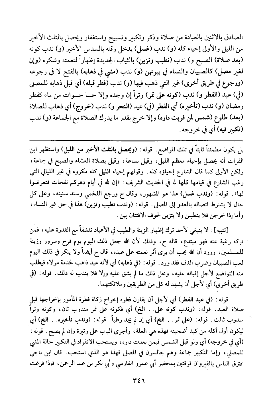 تنبيه : لا ينبغي لأحد ترك إظهار الزينة والطيب في الأعياد تقشفاً مع القدرة عليه ، فمن تركه رغبة عنه فهو مبتدع ، قاله ( ح ) . وذلك لأن الله جعل ذلك اليوم فرح وسرور وزينة للمسلمين وورد : ( إن الله يحب أن يرى أثر نعمته على عبده ) ، قال ( ح ) أيضاً ولا ينكر في ذلك اليوم لعب الصبيان وضرب الدف فقد ورد .