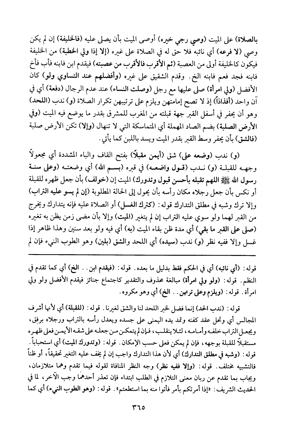 قوله : 16 ( للقبلة ) : أي لأنها أشرف المجالس ، أي وتحل عقد كفنه وتمد يده اليمنى على جسده ، ويعدل رأسه بالتراب ورجلاه برفق ، ويجعل التراب خلفه وأمامه لئلا ينقلب ، فإن لم يتمكن من جعله على شقه الأيمن فعلى ظهره مستقبلا للقبلة بوجهه ، فإن لم يمكن فعلى حسب الأمكان .