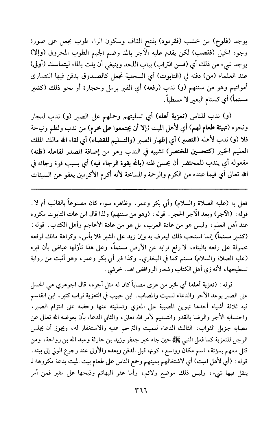 قوله : 16 ( تعزية أهله ) : أي لخبر : ( من عزى مصاباً كان له مثل أجره ) ، قال الجوهري : هي الحمل على الصبر بوعد الأجر والدعاء للميت والمصاب . ( وقال ) ابن حبيب في التعزية ثواب كثير ، ( وقال ) ابن القاسم ثلاثة أشياء : أحدهما : تهوين المصيبة على المعزي وتسليته عنها وحضه على التزام الصبر واحتسابه الأجر والرضا بالقدر والتسليم لأمر الله تعالى . الثاني : الدعاء بأن يعوضه الله تعالى عن مصابه جزيل الثواب . الثالث : الدعاء للميت والترحم عليه والاستغفار له : ويجوز أن يجلس الرجل للتعزية كما فعل النبي حين جاى خبر جعفر وزيد ابن حارثة و عبدالله بن رواحة ومن قتل معهم بمؤتة ، اسم مكان . وواسع كونها قبل الدفن وبعده ، والأولى عند رجوع الولي إلى بيته .