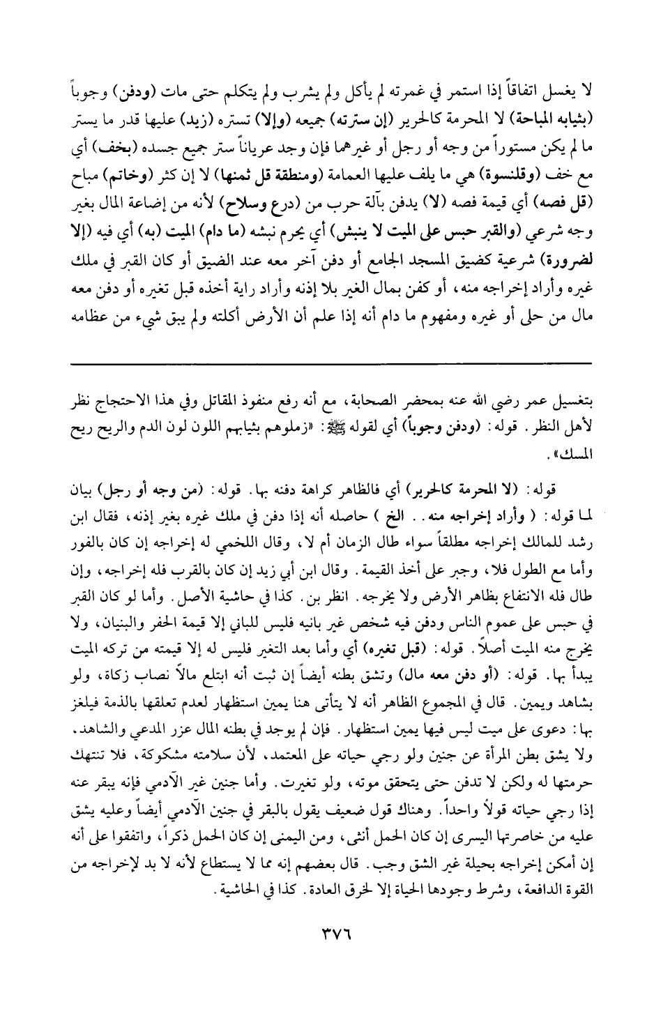 بتغسيل عمر رضي الله عنه بمحضر الصحابة مع أنه رفع منفوذ المقاتل ، وفي هذا الاحتجاج نظر لأهل النظر .