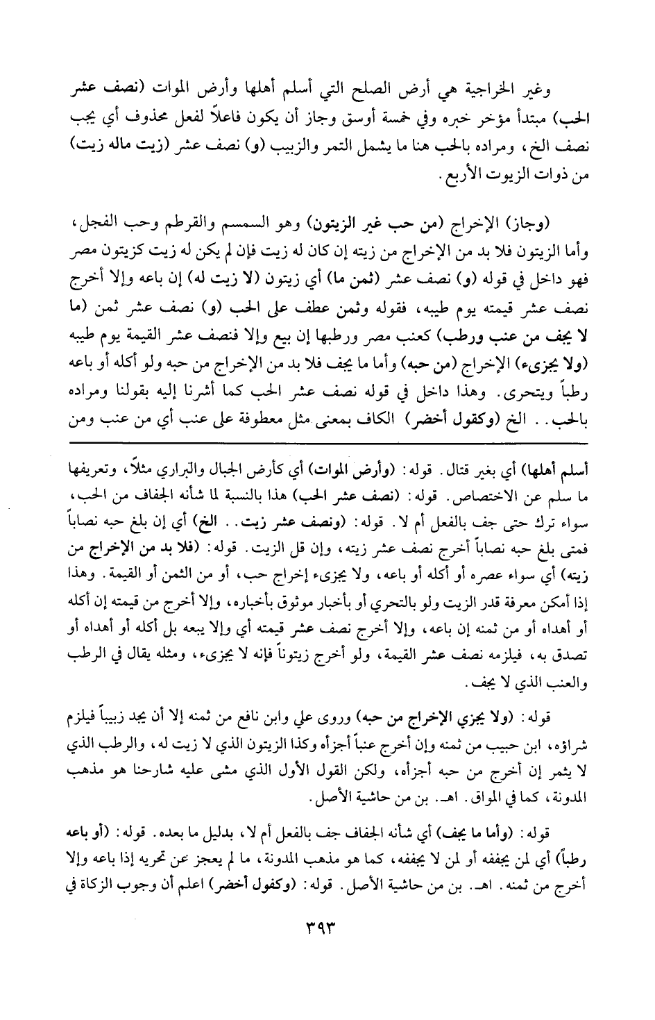 قوله : 6 ( فلا بد من الإخراج من زيته ) : أي سواء عصره أو أكله أو باعه ، ولا يجزىء إخراج حب ومن الثمن أو القيمة ، وهذا إذا أمكن معرفة قدر الزيت ولو بالتحري ، أو بإخباره ؛ وإلا أخرج من قيمته إن أكله أو أهداه أو من ثمنه إن باعه ، وإلا أخرج نصف عشر قيمته ، أي وإلا يبعه بل أكله أو أهداه أو تصدق به فيلزمه نصف عشر القيمة . ولو أخرج زيتوناً فإنه لا يجزىء ، ومثله يقال في الرطب والعنب الذي لا يجف .