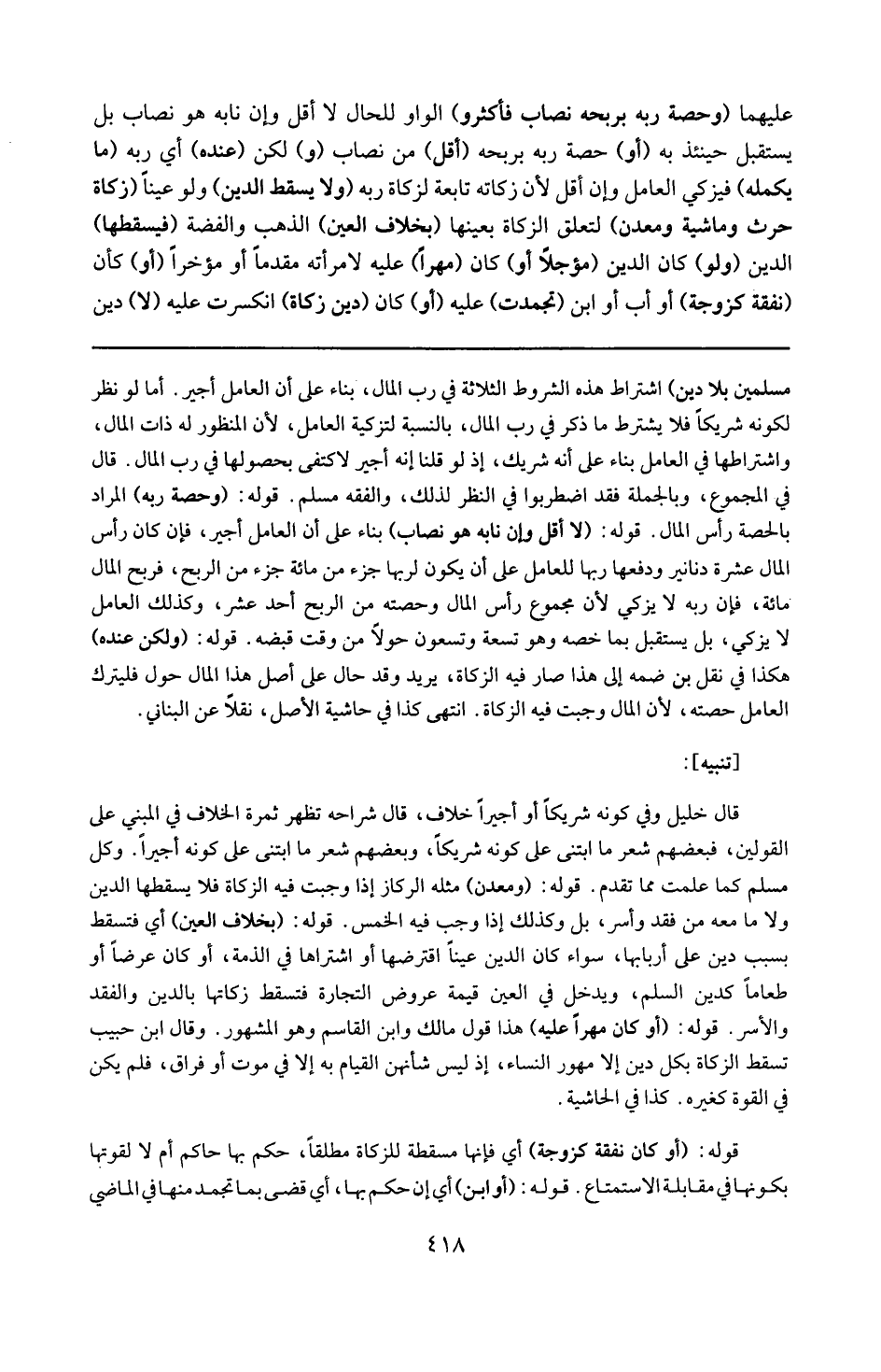 مسلمين بلا دين ) : اشتراطا هذه الشروط الثلاثة في رب المال بناء على أن العامل أجير . أما لو نظر لكونه شريكاً فلا يشترط ما ذكر في رب المال بالنسبة لتزكيه العامل ؛ إذ لو قلنا إنه أجير لاكتفى بحصولها في رب المال . قال في المجموع : وبالجملة فقد اضطربوا في النظر لذلك ، والفقه : مسلم .