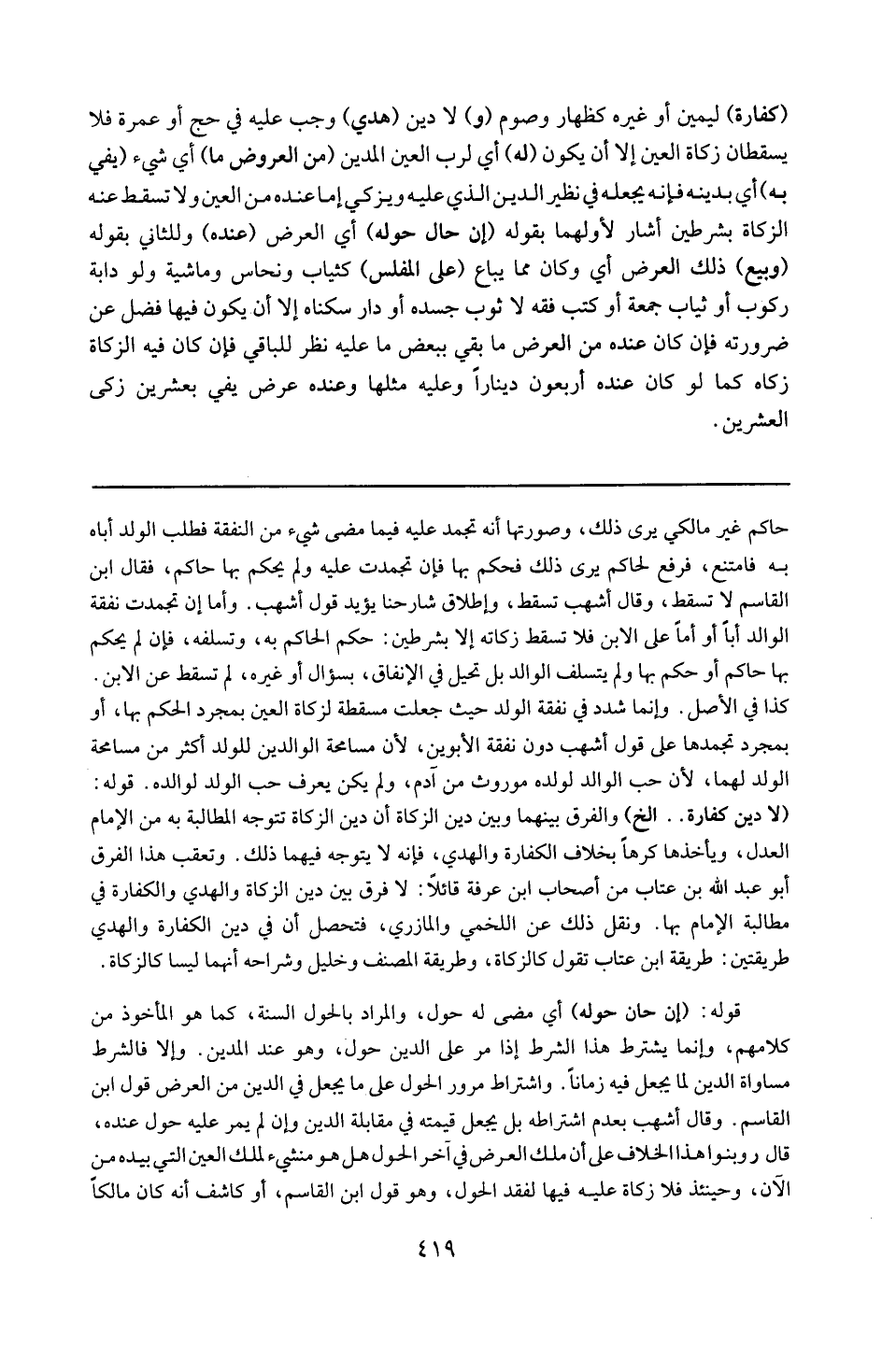حاكم غير مالكي يرى ذلك . وصورتها أنه تجمد عليه فيما مضى شيء من النفقة فطلب الولد أباه به ، فامتنع فرفع لحاكم يرى ذلك فحكم بها . فإن تجمدت عليه ولم يحكم بها حاكم ، فقال ابن قاسم : لا تسقط ، وقال أشهب ) تسقط ، وإطلاق شارحنا يؤيد قول أشهب . وأما إن تجمدت نفقة الوالد أباً وأماً على الابن فلا تسقط زكاته إلا بشرطين : حكم الحاكم بها ، وتسلفه ، فإن لم يحكم بها حاكم أو حكم بها ولم يتسلف الوالد بل تحيل في الإنفاق بسؤال أو غيره ، لم تسقط عن الابن كذا في الأصل . وإنما شدد في نفقة الوالد حيث جعلت مسقطة لزكاة العين بمجرد الحكم بها أو بمجرد تجمدها على قول أشهب دون نفقة الأبوين ، لأن مسامحة الوالدين للولد أكثر من مسامحة الولد لهما لأن حب الوالد لولده موروث من آدم ، ولم يكن يعرف حب الولد لوالده .