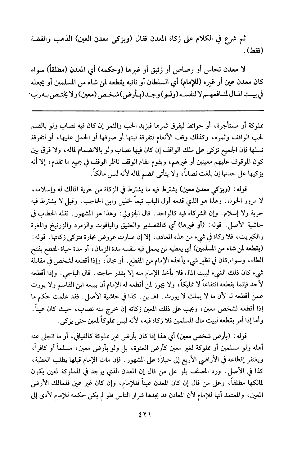 قوله 19 ( ويزكى معدن العين ) : يشترط فيه ما يشترط في الزكاة من حرية المالك له وإسلامه ، لا مرور الحول . وهذا هو الذي قدمه أول الباب تبعاً لخليل و ابن حاجب ، وقيل : لا يشترط فيه حرية ولا إسلام وأن الشركاء فيه كالواحد ، قال الجزولي وهذا هو المشهور . نقله الحطاب في حاشية الأصل .