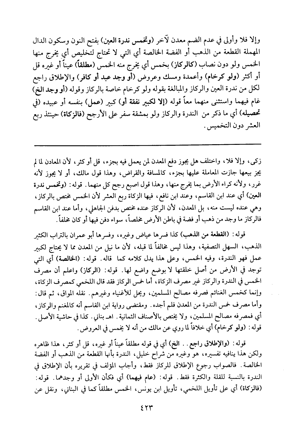 قوله : 16 ( القطعة من الذهب ) : كذا فسرها عياض وغيره . وفسرها أبو عمران بالتراب الكثير الذهب السهل التصفية ، وهذا ليس مخالفاً لما قبله ؛ لأن ما نيل من المعدن مما لا يحتاج لكبير عمل فهو الندرة وفيه الخمس ، وعلى هذا يدل كلامه كما قال ( ر ) .