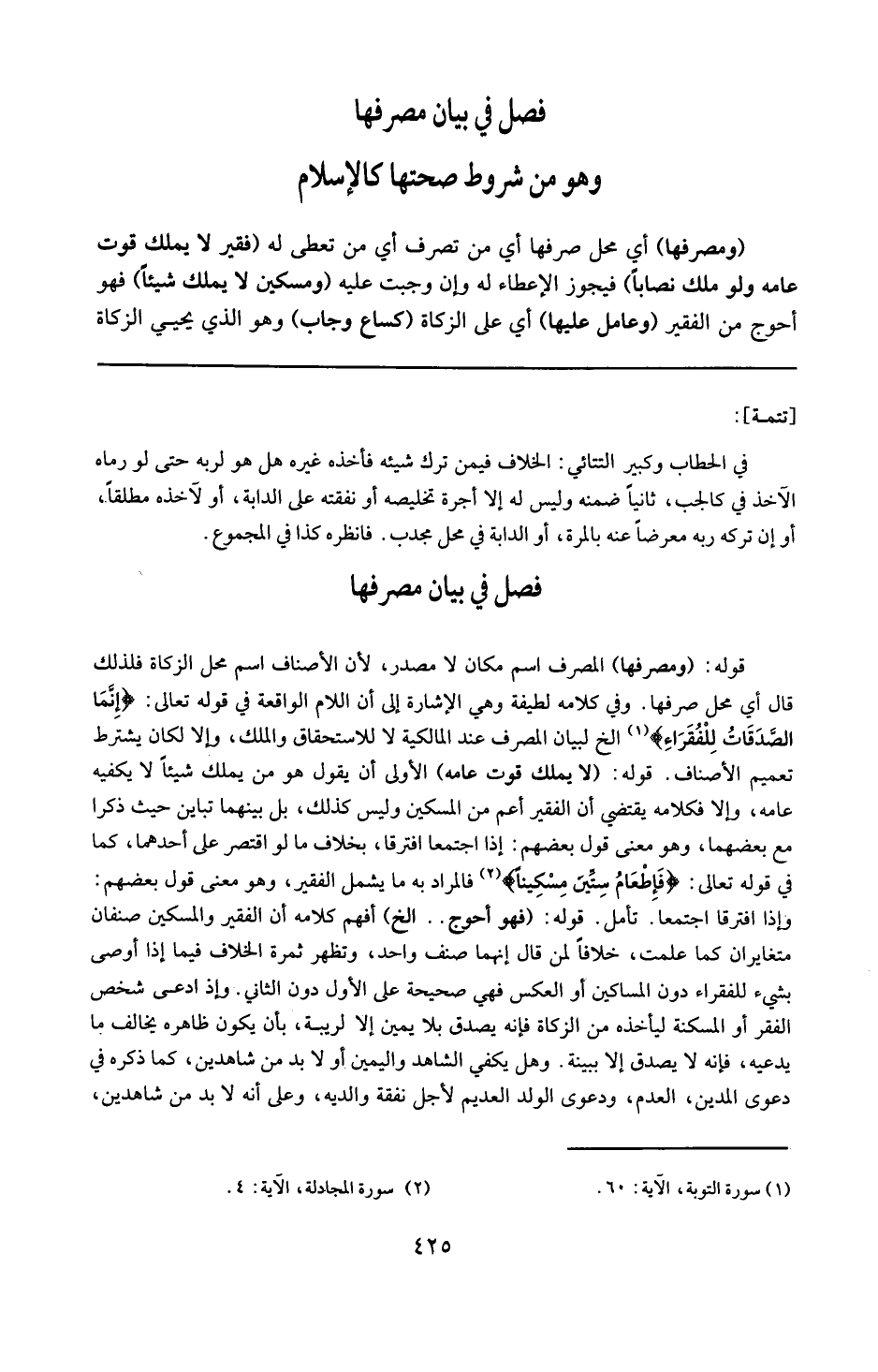 قوله : 16 ( ومصرفها ) : المصرف اسم مكان لا مصدر ؛ لأن الأصناف اسم محل الزكاة فلذلك قال : ( أي محل صرفها ) . وفي كلامه لطيفة : وهي الإشارة إلى أن اللام الواقعة في قوله تعالى : { إنما الصدقات للفقراء } الخ ، لبيان المصرف عند المالكية لا للاستحقاق والملك ، وإلا لكان يشترط تعميم الأصناف .