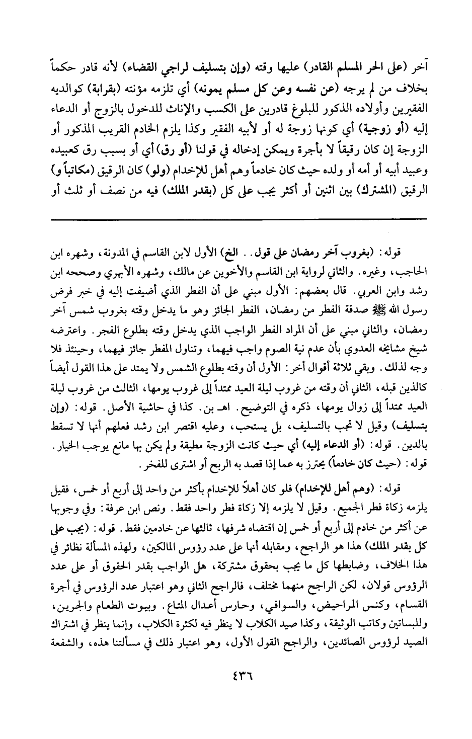 قوله : 16 ( بغروب آخر رمضان على قول ) الخ : الأول لابن القاسم في المدونة وشهره ابن الحاجب وغيره ، والثاني لرواية ابن القاسم والأخوين عن مالك وشهره الأبهري وصححه ابن رشد و ابن العربي . قال بعضهم ؛ الأول : مبني على الفطر الذي أضيفت إليه في خبر : ( فرض رسول الله صدقة الفطر من رمضان ) : الفطر الجائز وهو ما يدخل وقته بغروب شمس آخر رمضان ، والثاني مبني على أن المراد الفطر الواجب الذي يدخل وقته بطلوع الفجر . واعترضه شيخ مشايخه العدوي بأن عدم نية الصوم واجب فيهما ، وتناول المفطر جائز فيهما ، وحينئذ فلا وجه لذلك . وبقي ثلاثة أقوال أخر : الأول : أن وقته بطلوع الشمس ولا يمتد على هذا القول أيضاً كالذين قبله . الثاني : أن وقته من غروب ليلة العيد ممتداً إلى غروب يومها . الثالث : من غروب ليلة العيد ممتداً إلى زولها يومها . ذكره في التوضيح ( ا هـ . بن كذا في حاشية الأصل ) .