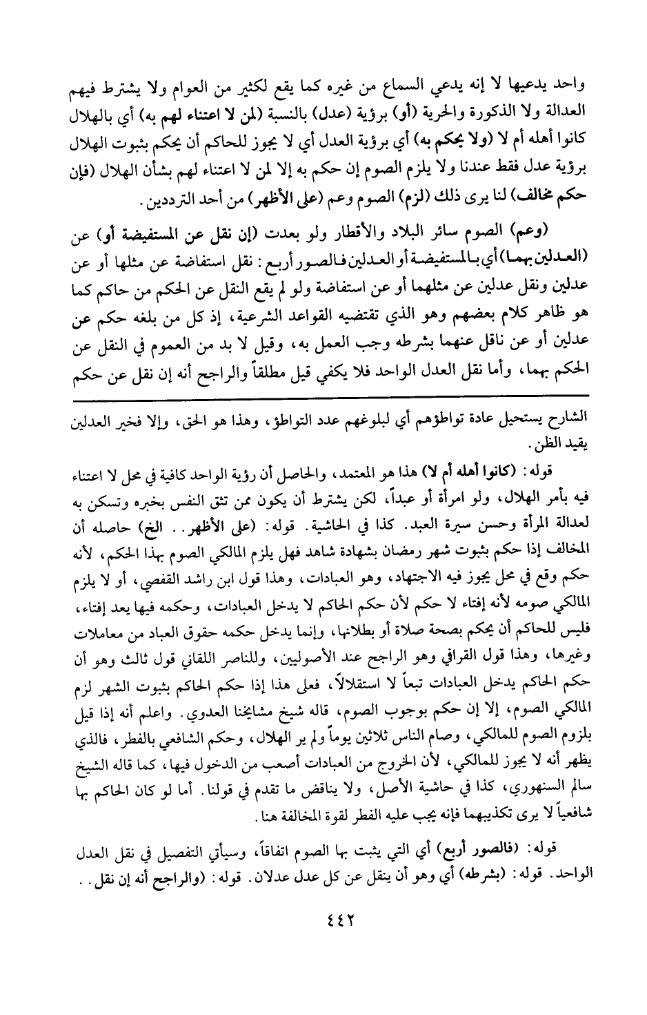 والحاصل أن رؤية الواحد كافية في محل لا اعتناء فيه بأمر الهلال ولو امرأة أو عبداً ، لكن يشترط أن يكون ممن تثق النفس بخبره وتسكن به لعدالة المرأة وحسن سير العبد كذا في الحاشية .
