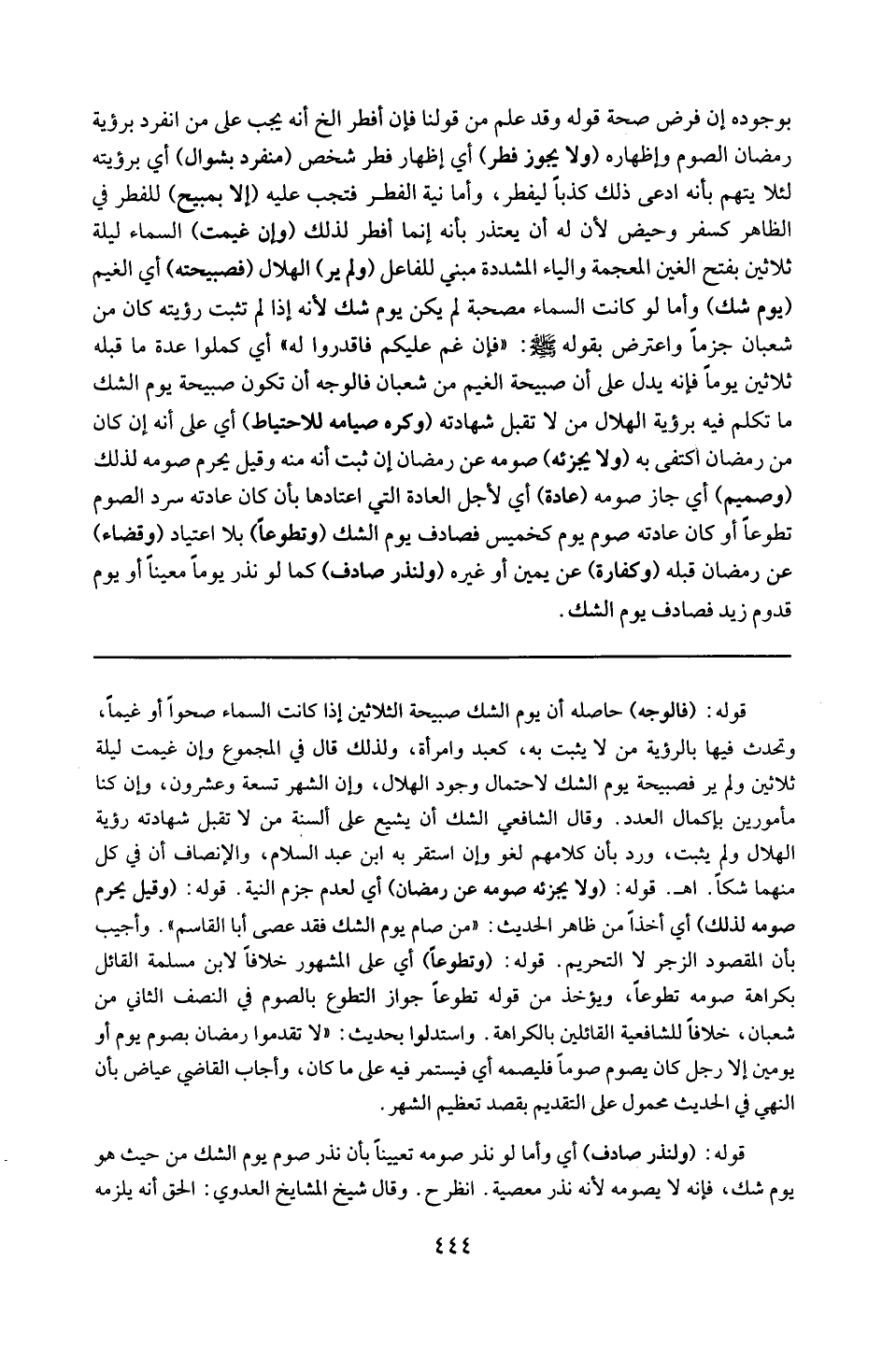 قوله : 16 ( كالوجه ) : حاصله : أي يوم الشك صبيحة الثلاثين إذا كانت السماء صحواً أو غيماً وتحدث فيها بالرؤية من لا يثبت به كعبد وامرأة ، ولذلك قال في المجموع : وإن غيمت ليلة ثلاثين ولم تر فصبيحته يوم الشك لاحتمال وجود الهلال وأن الشهر تسعة وعشرون ، وأن كنا مأمورين بإكمال العدد . وقال الشافعي : الشك أن يشيع على ألسنة من لا تقبل شهادته رؤية الهلال ولم يثبت ، ورد بأن كلامهم لغو وإن استقر به ابن عبد السلام والانصاف أن في كل منهما شكاً ( ا هـ . ) .