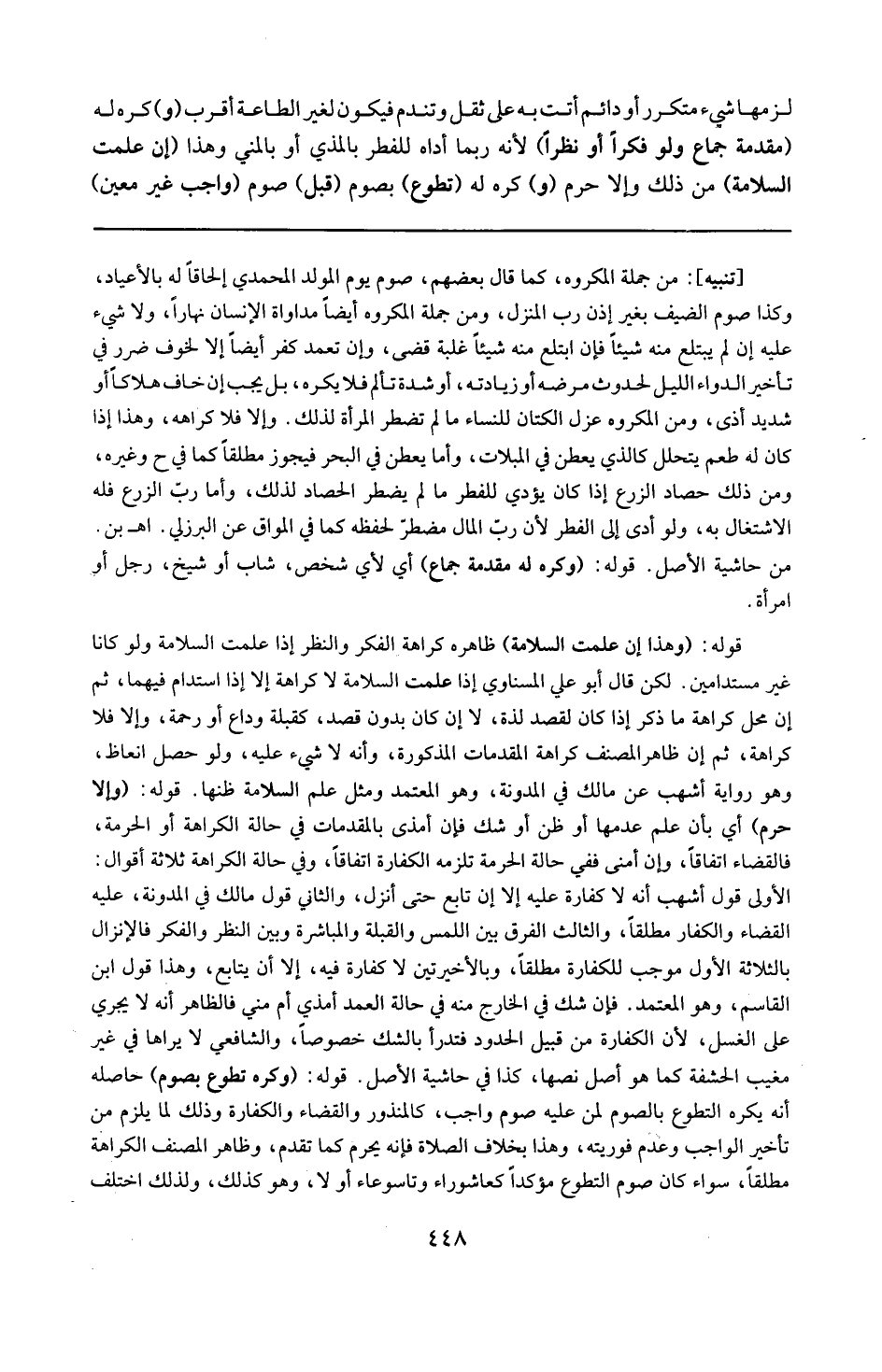 تنبيه : من جملة المكروه كما قال بعضهم صوم يوم المولد المحمدي إلحاقاً له بالأعياد ، وكذا صوم الضيف بغير إذن رب المنزل ، ومن جملة المكروه أيضاً مداواة الإنسان نهاراً ولا شيء عليه إن لم يبتلع منه شيئاً ، فإن ابتلع منه شيئاً غلبة قضى ، وإن تعمد كفر أيضاً ، إلا لخوف ضرر في تأخير الدواء لليل لحدوث مرضه أو زيادته أو شده تألم فلا يكره ، بل يجب إن خاف هلاكاً أو شديد أذى . ومن المكروه غزل الكتان للنساء ما لم تضطر المرأة لذلك ، وإلا فلا كراهة ، وهذا إذا كان له طعم يتحلل كالذي يعطن في الميلات ، وأما ما يعطن في البحر فيجوز مطلقاً كما في ( ح ) وغيره ، ومن ذلك حصاد الزرع إذا كان يؤدي للفطر ما لم يضطر الحصاد لذلك ، وأما رب الزرع فله الاشتغال به ولو أدى إلى الفطر ، لأن رب المال مضطر لحفظه كما في الموا عن البرزلي ( اه . بن من حاشية الأصل ) .