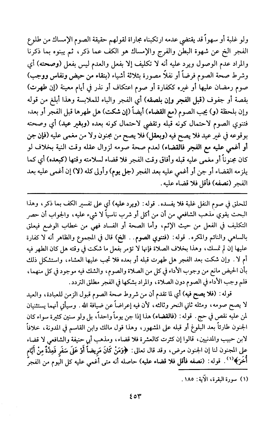 قوله : 16 ( فالقضاء ) : هذا إذا جن يوماً واحداً بل ولو سنين كثيرة ، سواء كان الجنون طارئاً بعد البلوغ أو قبله على المشهور . وهذا قول مالك و ابن قاسم في المدونة ، خلافاً لابن حبيب والمدنيين ، قالوا : إن كثرت كالعشرة فلا قضاء . ومذهب أبي حنيفة و الشافعي : لا قضاء على المجنون . لنا أن الجنون مرض وقد قال تعالى : { ومن كان مريضاً أو على سفر فعدة من أيام أخر } .