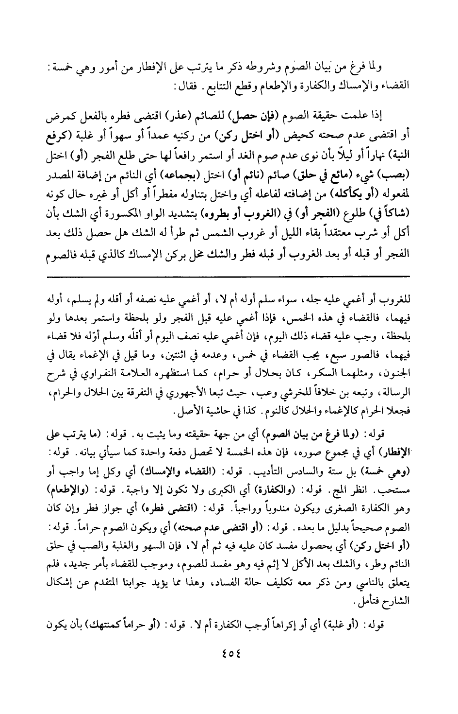 قوله : 16 ( والإطعام ) : وهو الكفارة الصغرى ، ويكون مندوباً وواجباً . 16 ( قوله اقتضى فطره ) : أي جواز فطره وإن كان الصوم صحيحاً بدليل ما بعده . 16 ( قوله أو اقتضى عدم صحته ) : أي ويكون الصوم حراماً . 16 ( قوله أو اختل ركن ) : أي بحصول مفسد كان عليه فيه إثم أم لا ، فإن السهو والغلبة والصب في حلق النائم ، وطروّ الشك بعد الأكل لا إثم فيه ، وهو مفسد للصوم وموجب للقضاء بأمره جديد ، فلم يتعلق بالناسي ومن ذكر معه تكليف حالة الفساد ، وهذا مما يؤيد جوابنا المتقدم عن إشكال الشارح فتأمل . 16 ( قوله أو غلبة ) : أي أو إكراهاً أوجب الكفارة أن لا . 16 ( قوله أو حراماً كمنتهك ) : أي بأن يكون