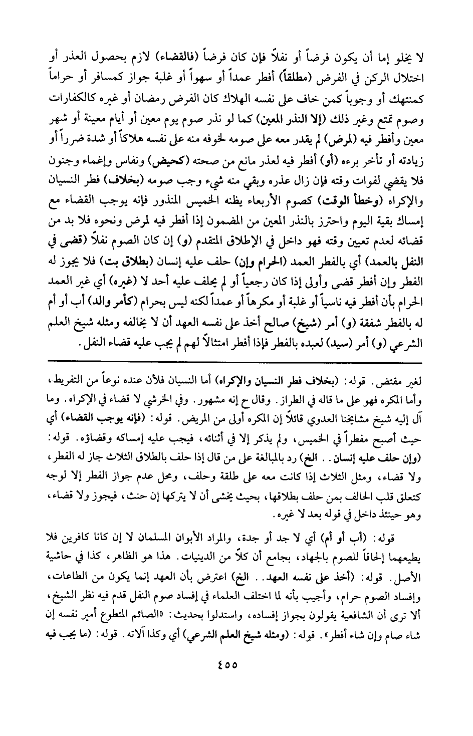 قوله : 16 ( وإن حلف عليه إنسان ) إلخ : رد بالمبالغة على من قال : إذا حلف عليه بالطلاق الثلاث جاز له الفطر ، و لا قضاء ، ومثل الثلاث : إذا كانت معه على طلقة وحلف بها . ومحل عدم جواز الفطر إلا لوجه ؛ كتعلق قلب الحالف بمن حلف بطلاقها ، بحيث يخشى أن لا يتركها إن حنث فيجوز ، ولا قضاء . وهو حينئذ داخل في قوله بعد لا غيره . 16 ( قوله : 6 ( أب أو أم ) : أي لا جد أو جدة . والمراد الأبوان المسلمان ، لا إن كانا كافرين فلا يطيعهما إلحاقاً للصوم بالجهاد ، بجامع إن كلا من الدينيات ، هذا هو الظاهر كذا في حاشية الأصل .