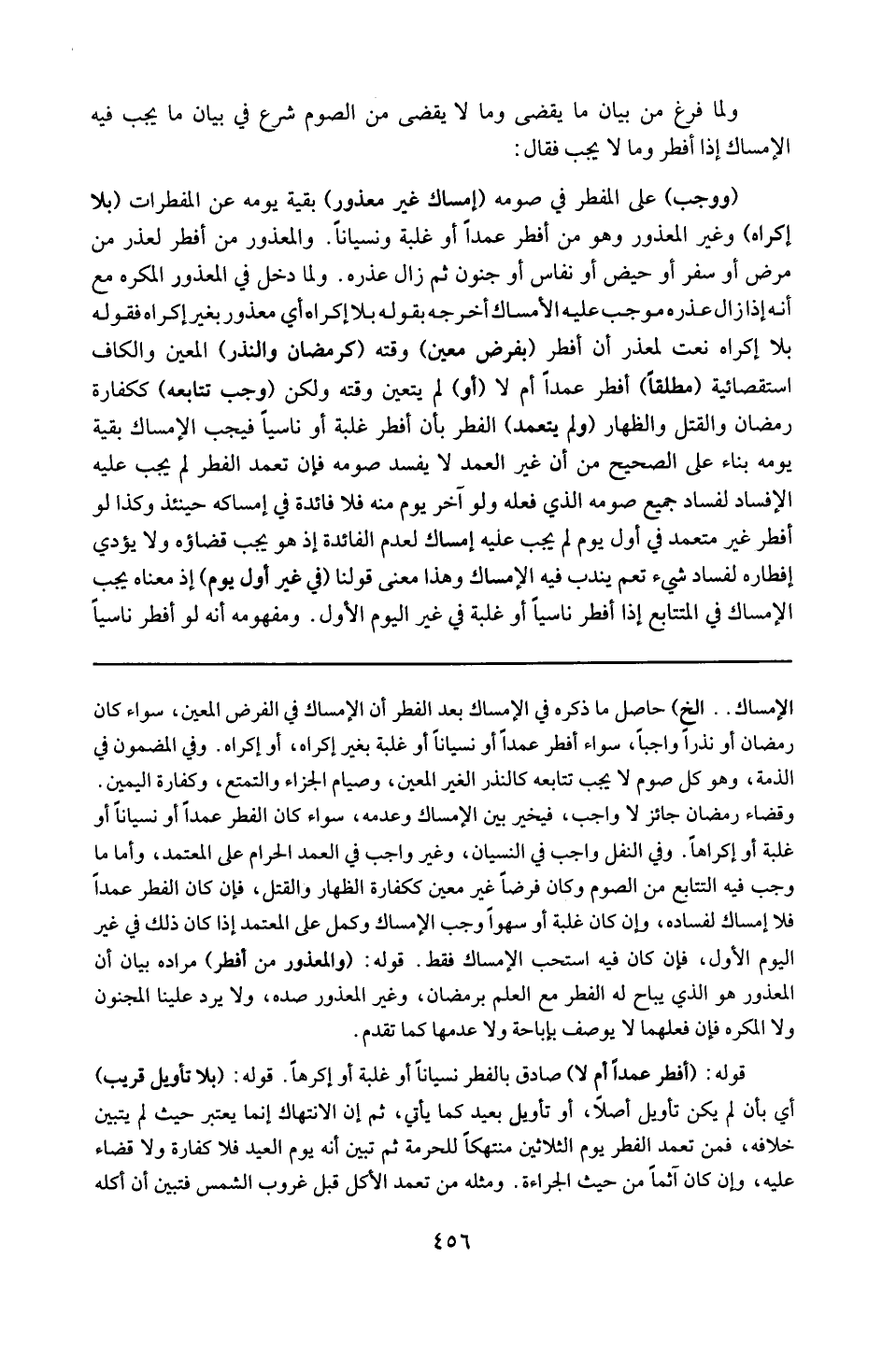 الإمساك ) إلخ : )6 ( حاصل ما ذكره في الإمساك بعد الفطر : أن الإمساك في الفرض المعين سواء كان رمضان أو نذراً واجب ، سواء أفطر عمداً أو نسياناً أو غلبة بغير إكراه ، أو إكراه . وفي المضمون في الذمة وهو كل صوم لا يجب تتابعه ؛ كالنذر الغير المعين وصيام الجزاء والتمتع وكفارة اليمين وقضاء رمضان جائز لا واجب ، فيخير بين الإمساك وعدمه سواء كان الفطر عمداً أو نسياناً أو غلبة أو إكراهاً ، وفي النفل واجب في النسيان وغير واجب في العمد الحرام على المعتمد . وأما ما وجب فيه التابع من الصوم وكان فرضاً غير معين ؛ ككفارة الظهار والقتل ، فإن كان الفطر عمداً فلا إمساك لفساده وإن كان غلبة أو سهواً وجب الإمساك ، وكمل على المعتمد إذا كان ذلك في غير اليوم الأول ، فإن كان فيه استحب الإمساك فقط .