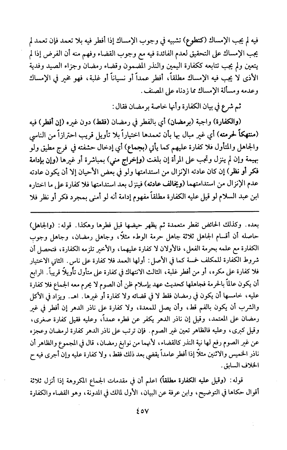 قوله : 16 ( وقيل عليه الكفارة مطلقاً ) : اعلم أن في مقدمات الجماع المكروهة إذا أنزل ثلاثة أقوال حكاها في التوضيح و ابن عرفة عن البيان . الأول : لمالك في المدونة وهو القضاء والكفارة