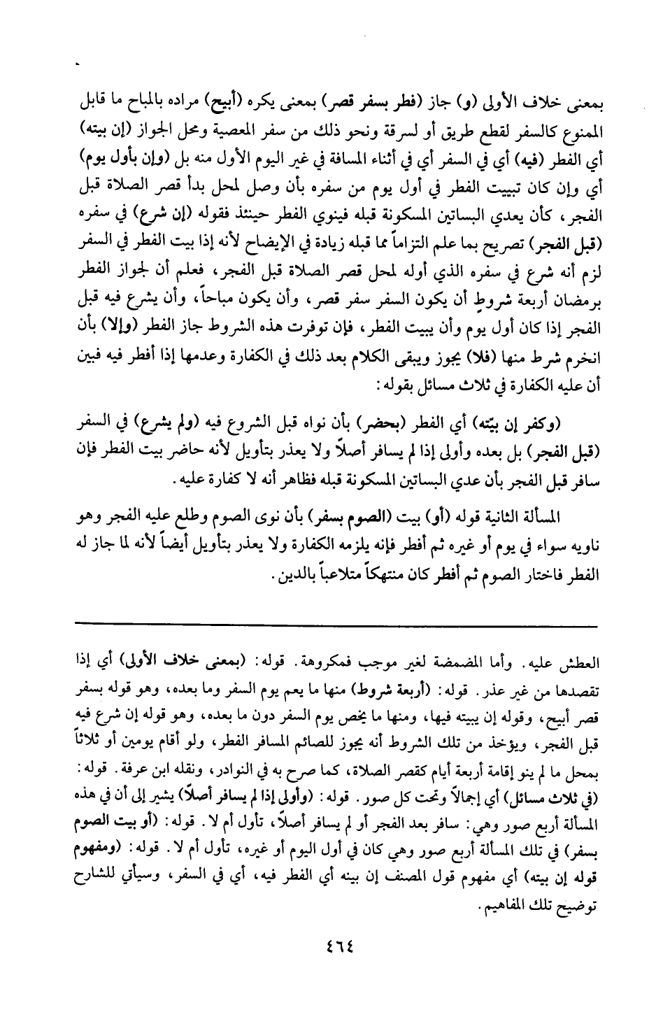قوله : 16 ( أربعة شروط ) : منها ما يعم يوم السفر وما بعده وهو قوله : ( بسفر قصر أبيح ) ، وقوله ( أن يبيته فيه ) ، ومنها ما يخص يوم السفر دون ما بعده ، وهو قوله ( إن شرع فيه قبل الفجر ) ويؤخذ من تلك الشروط أنه يجوز للصائم المسافر الفطر ، ولو أقام يومين أو ثلاثاً بمحل ، ما لم ينو إقامة أربعة أيام كقصر الصلاة كما صرح به في النوادر ، ونقله ابن عرفة .