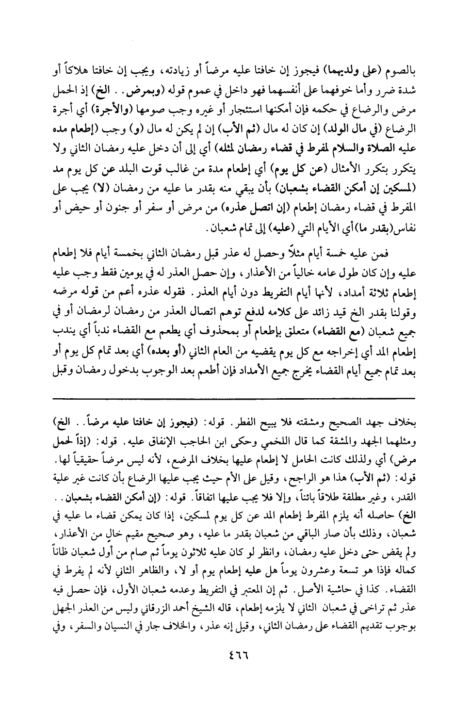 قوله : 6 ( وإن أمكن القضاء بشعبان ) الخ : حاصله : أنه يلزم المفرط إطعام المد عن كل يوم لمسكين إذا كان يمكن قضاء ما عليه في شعبان ، وذلك بأن صار الباقي من شعبان بقدر ما عليه وهو صحيح مقيم خال من الأعذار ، ولم يقض حتى دخل عليه رمضان ، وانظر لو كان عليه ثلاثون يوماً ، ثم صام من أول شعبان طاناً كماله فإذا هو تسعة وعشرون يوماً هل عليه إطعام يوم أو لا والظاهر الثاني لأنه لم يفرط في القضاء كذا في حاشية الأصل ، ثم إن المعتبر في التفريط وعدمه شعبان الأول ، فإن حصل فيه عذر ثم تراخى في شعبان الثاني لا يلزمه إطعام ، قاله الشيخ أحمد الزرقاني وليس من العذر الجهل بوجوب تقديم القضاء على رمضان الثاني وقيل إنه عذر والخلاف جار في النسيان ، والسفر وفي