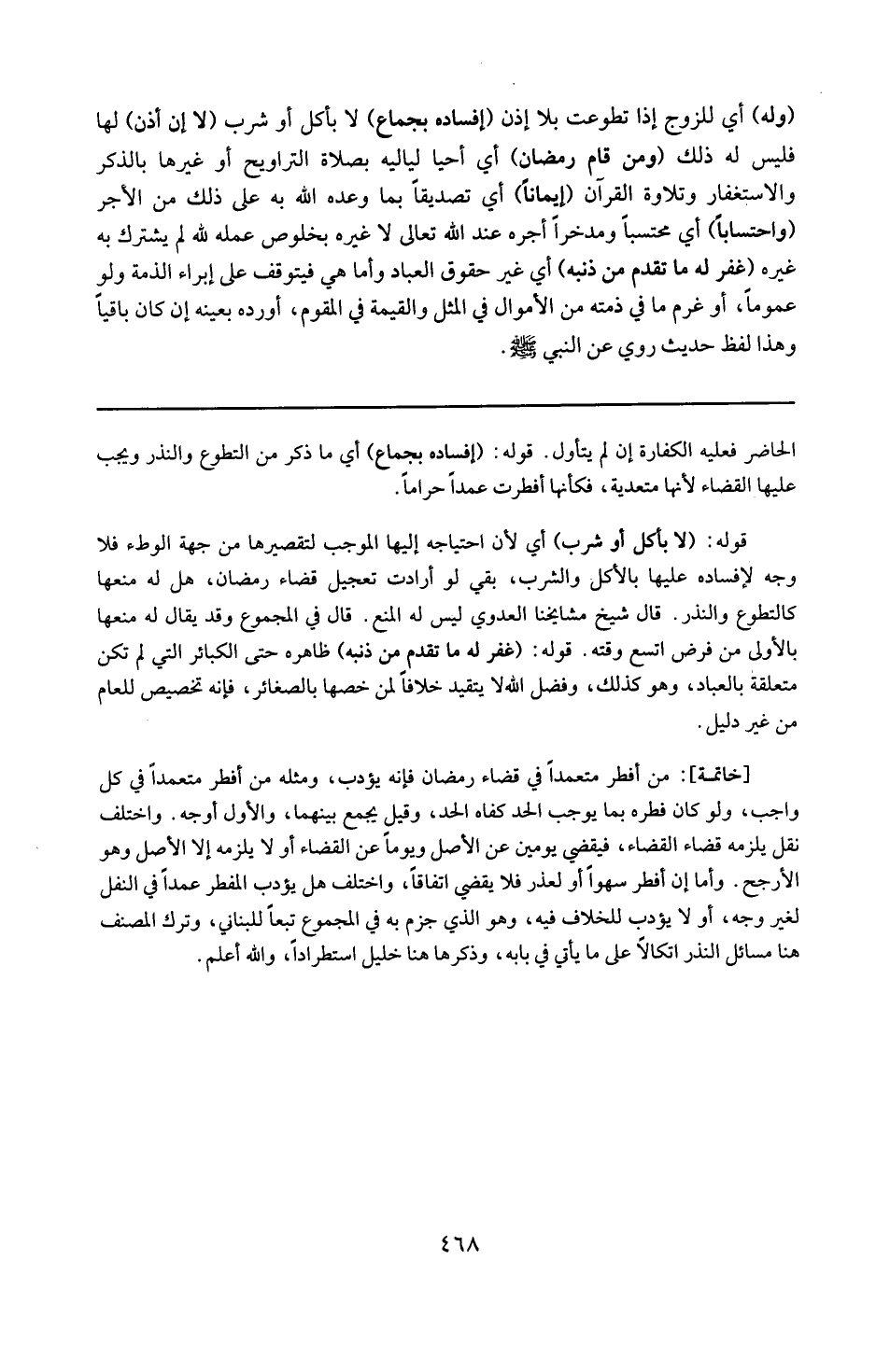 قوله : 16 ( لا بأكل أو شرب ) : أي لأن احتياجه إليها الموجب لتفطيرها من جهة الوطء فلا وجه لإفساده عليها بالأكل والشرب ، بقي لو أرادت تعجيل قضاء رمضان ، هل له منعها ؟ كالتطوع والنذر ، وقال شيخ مشايخنا العدوي : ليس له المنع . قال في المجموع : وقد يقال : له منعها بالأولى من فرض اتسع وقته .