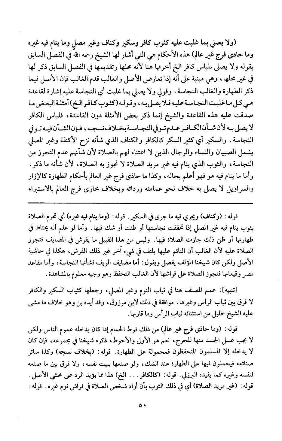 تنبيه : عمم المصنف هنا في ثياب النوم وغير المصلى وجعلها كثياب السكير والكافر لا فرق بين ثياب الرأس وغيرها ، موافقة فى ذلك لابن مرزوق وقد أيده 16 ( بن ) . وهو خلاف مامشى عليه الشيخ خليل من استثنائه ثياب الرأس وما قاربها .